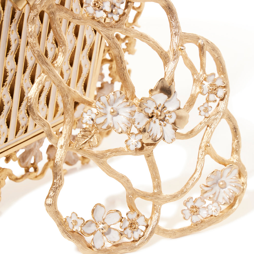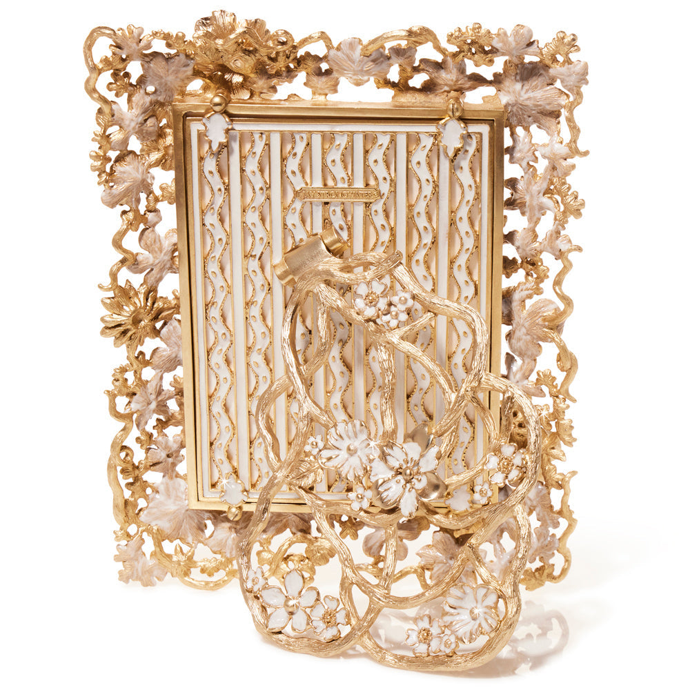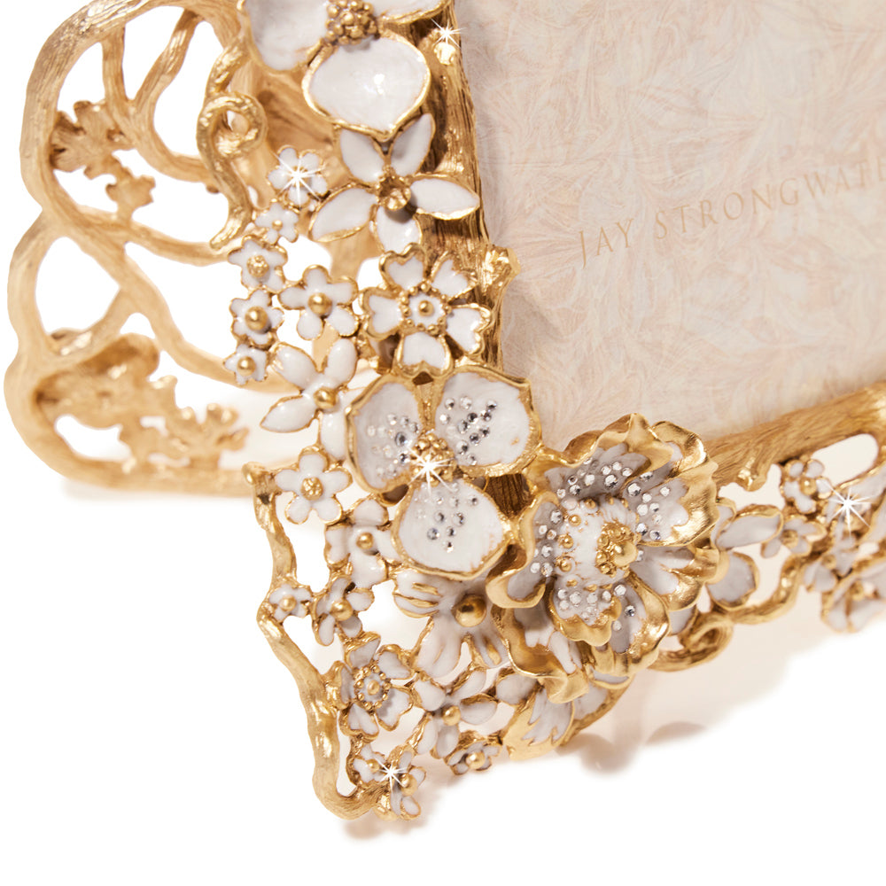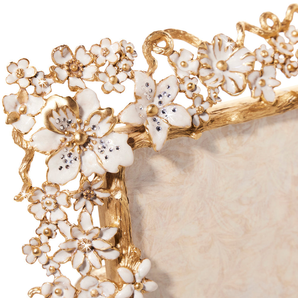 Introducing the Ophelia White Opal 5" x 7" picture frame. Crafted with zinc and finished with 18k matte gold with light brown antique. Hand enameled ivory blossoms surround your most cherished memories. This stunning frame is sure to enhance the beauty of any room.