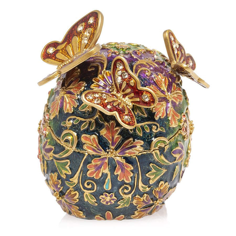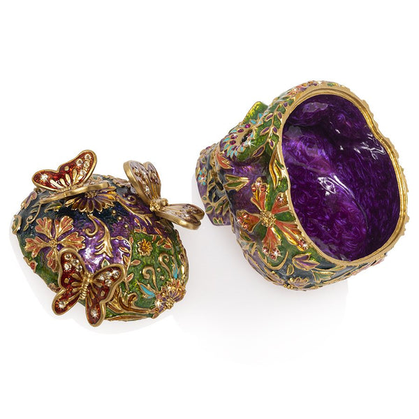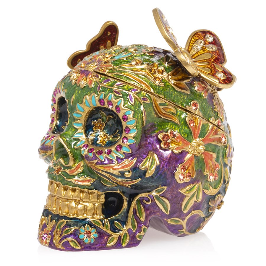 Inspired by the great heritage of Mexican sugar skulls, we first carved our Rivera Skull with Butterflies Box in clay with a raised all over floral pattern, highlighted with jeweled fluttering butterflies. Cast in metal, finished in 14K gold and beautifully painted in jewel tone colors of enamel and sparkling with hand-set Swarovski crystals in shades of fuchsia, padparadscha and topaz. Under the lid is a swirled purple enamel lined interior.