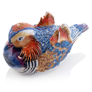 Hand-painted in incredible detail and a stunning array of colors, this Mandarin Duck box truly comes alive. Sparkling with 369 Swarovski® crystals, lift its lid to reveal a clean white enamel center framed by a luxe 14K gold rim. Delivering drama, beauty and just the right amount of whimsy, this piece will be right at home as a conversation-starting statement piece for any space.