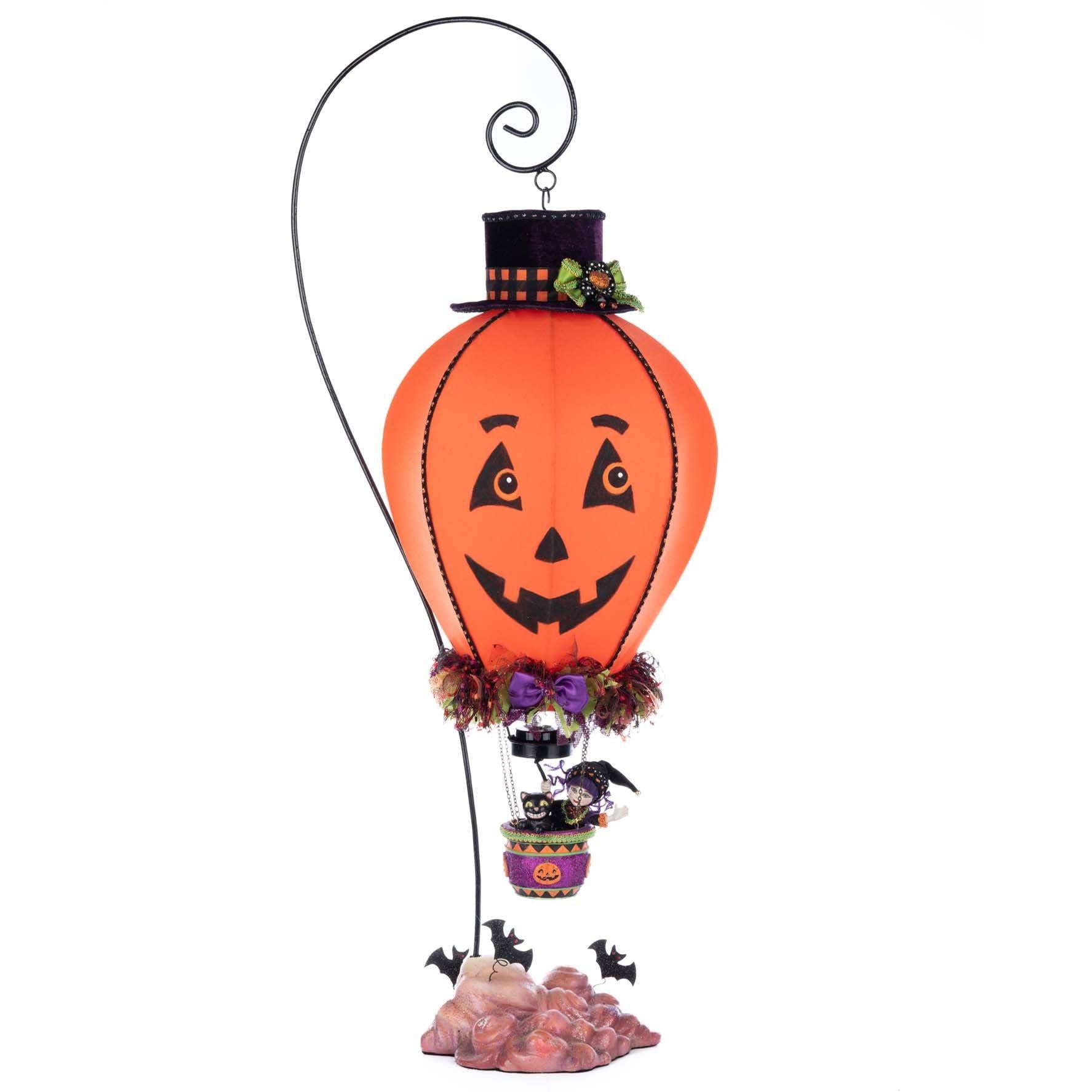Ghoulish Hot Air Balloon is an endearing pumpkin balloon that grins cheerfully, while lifting Poppy and her feline friend into a magical adventure. Floating above cotton candy-colored clouds and dizzy bats, this whimsical tabletop decor glows softly, casts an enchanting light over Halloween. Velvet, satin, pumpkin buttons, ruffles, and shimmering trims add a touch of festive flair.