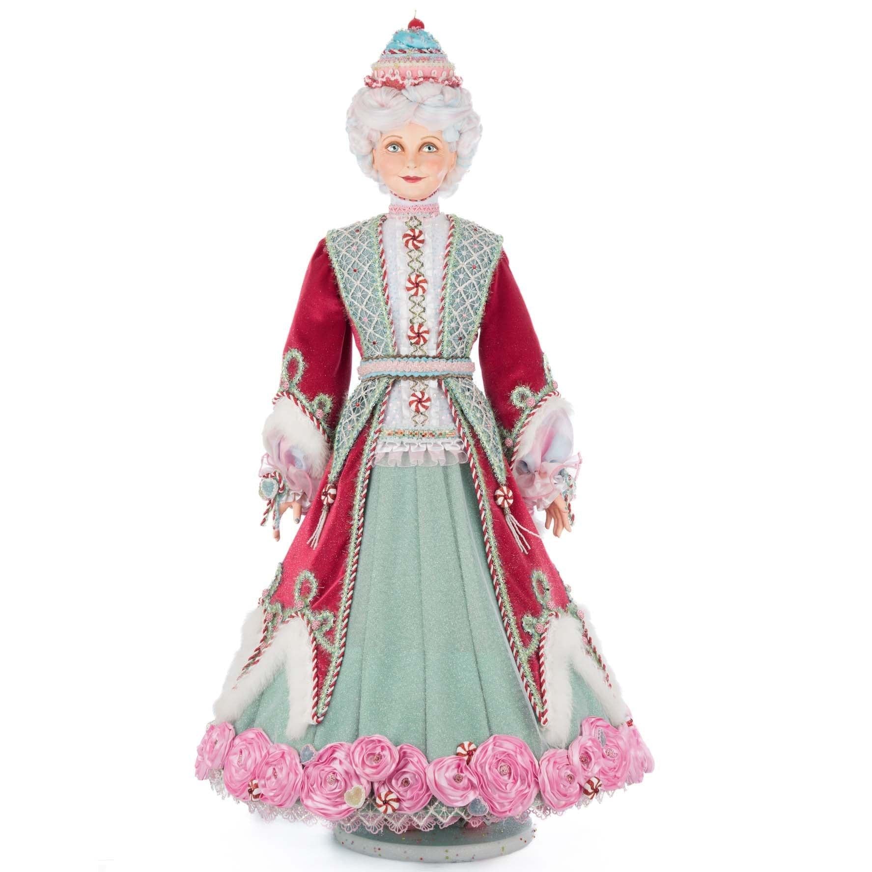 Kandi Kringleberry Mrs. Claus—a vision of holiday sweetness and sparkle! Wrapped in textured fabrics that shimmer with chunky glitter and sequins, she’s the perfect blend of sugar, glam, and seasonal cheer. Hand-placed colored jewels twinkle on metallic silver cut-out fabric, adding an irresistible touch of elegance to her candy-coated charm.