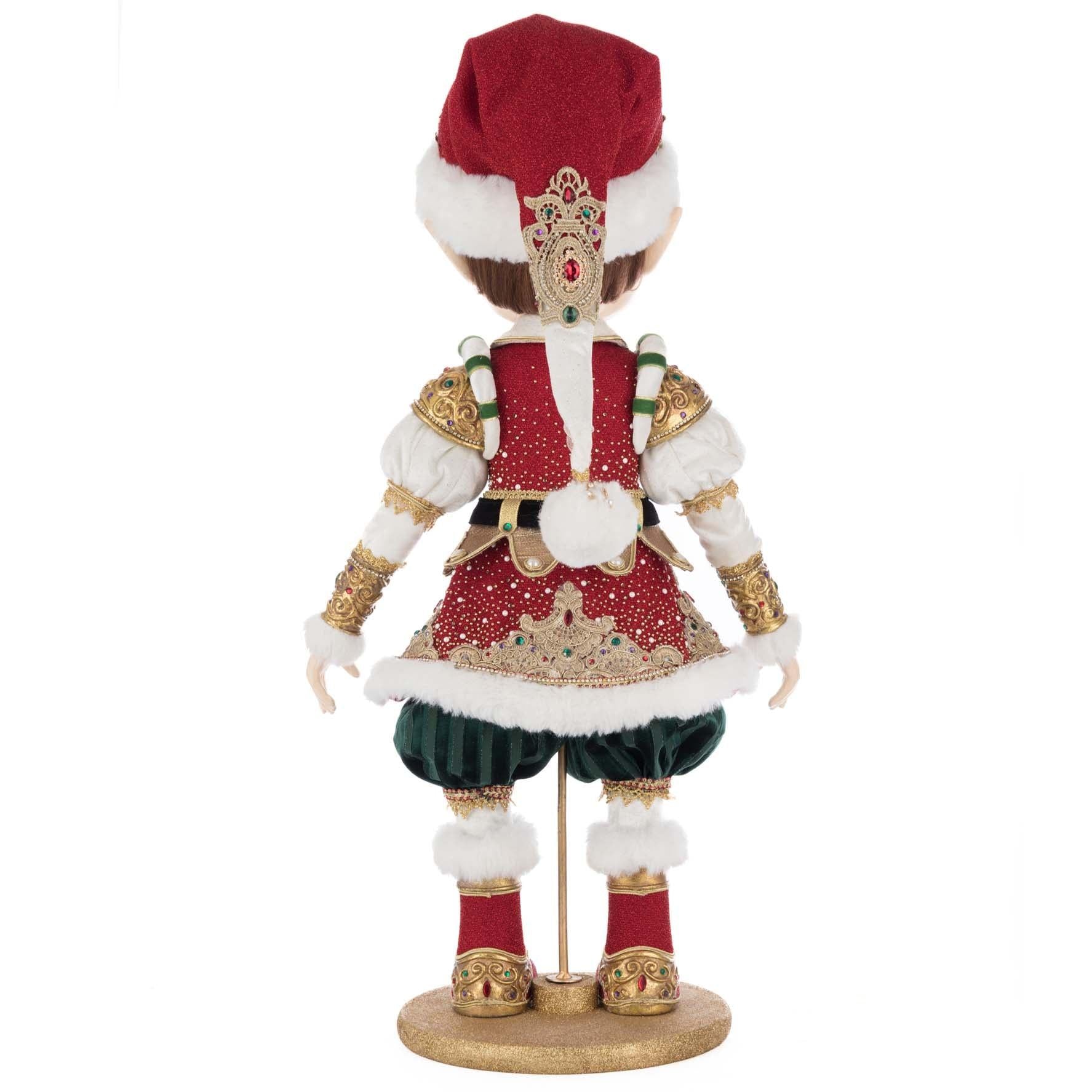 William Wintersnap is a darling 26.5" handcrafted tabletop elf doll, full of festive charm and whimsical delight. Dressed in rich red fabric embellished with faux fur, gold accents, and twinkling details, he brings a playful yet elegant touch to your holiday décor. A cheerful guest of the Royal Christmas Ball, he enchants all!