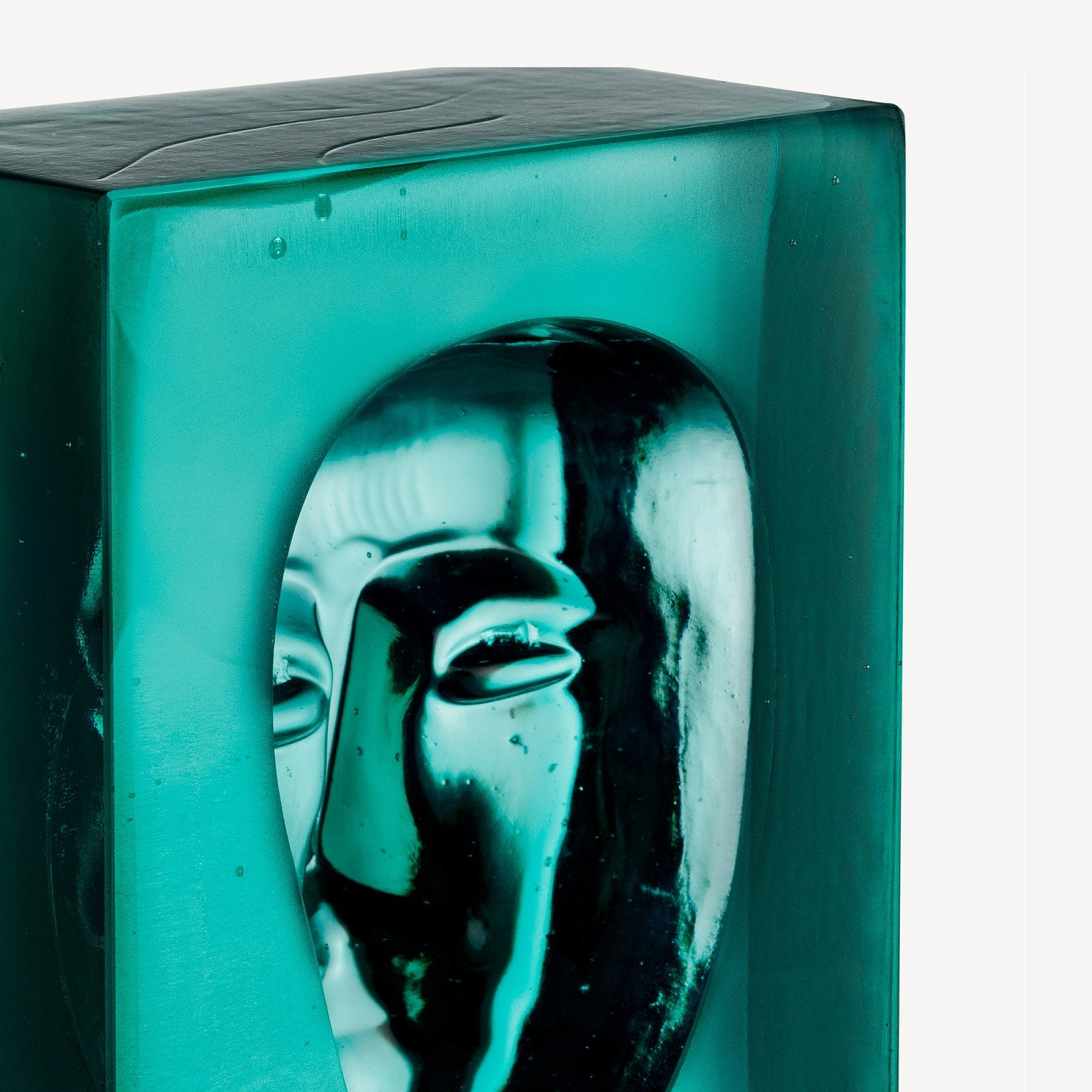 BV Azur Man Petrol blue, by Bertil Vallien, is part of the Kosta Boda Artist Collection. This object in petroleum blue is cast in a graphite mold. The mold creates an impression of one of Bertil Vallien's characteristic faces.