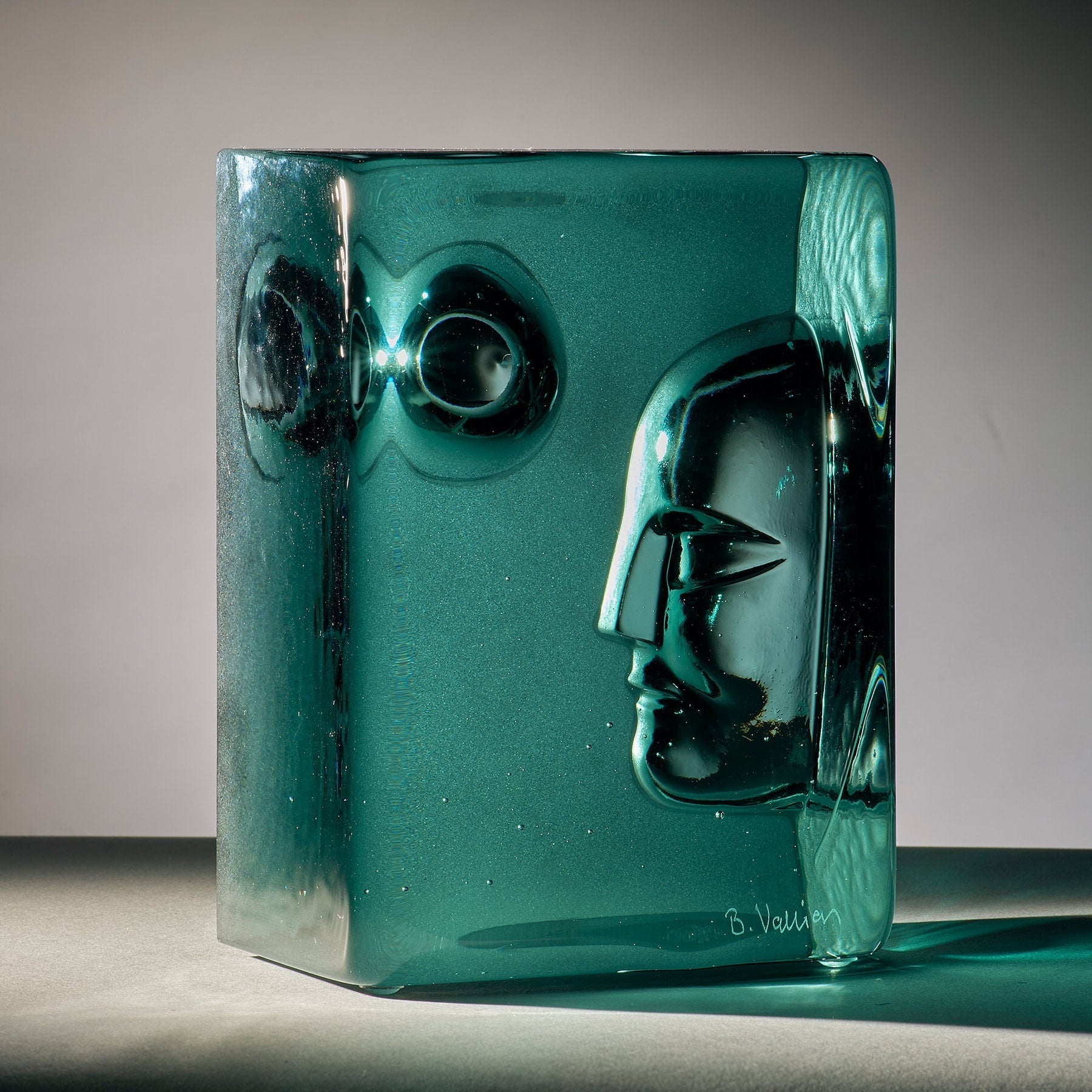 BV Azur Moon Petrol blue, by Bertil Vallien, is part of the Kosta Boda Artist Collection. This object in petroleum blue is cast in a graphite mold at Kosta Glassworks. The mold creates an impression of a face bathed in moonlight.