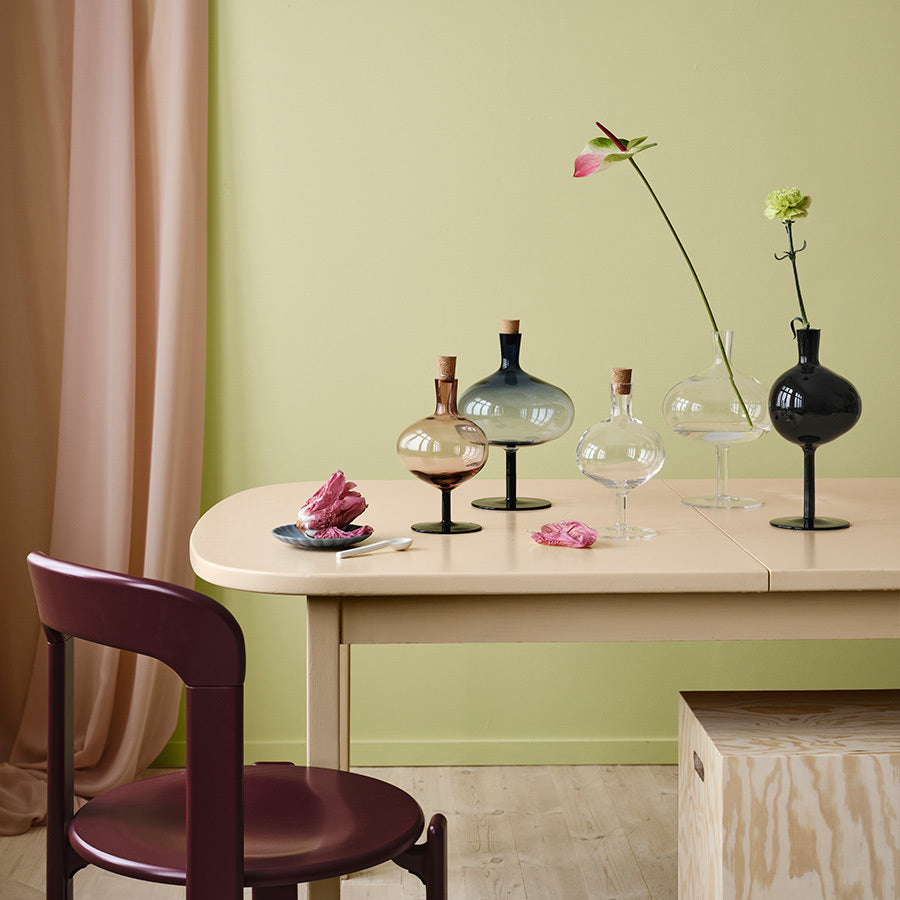 Award-nominated collection: Swedish Design Awards Like a tall wineglass, Bod balances confidently while its bowl captures the play of light. With their sheer and tall shape, the bottles are a piece of art that stands grounded in every home. The black glass bottle on foot has an opaque surface and can be used as a decorative object, vessel, or vase. • The removable cork is included • Handmade in Kosta, Sweden