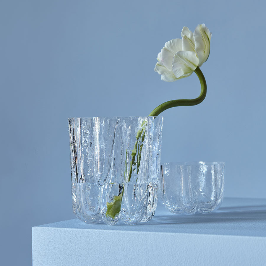 The Crackle collection is a tribute to cracks, beautifully preserved in glass. The intriguing design has a sculptural, expressive exterior that is created using an old craft technique, where the hot glass is dipped in ice-cold water. Crackle is mouth-blown in Kosta and designed by Åsa Jungnelius. This bowl/votive is made of clear glass.