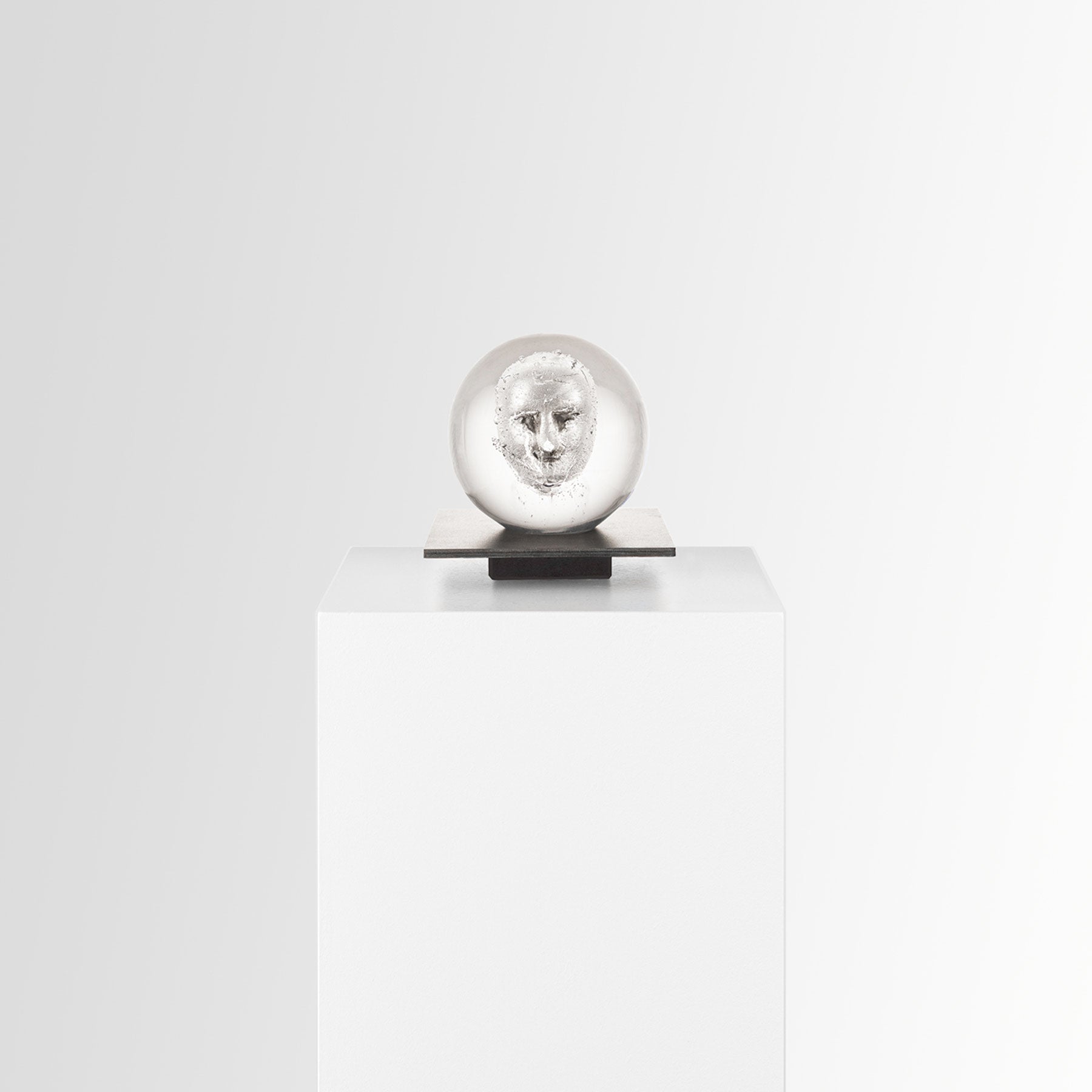 Headman by Bertil Vallien, from Kosta Boda Artist Collection, is shaped in clear glass with silver leaves forming a face in the center. The object stands on an iron plinth and is handmade at Kosta Glassworks.