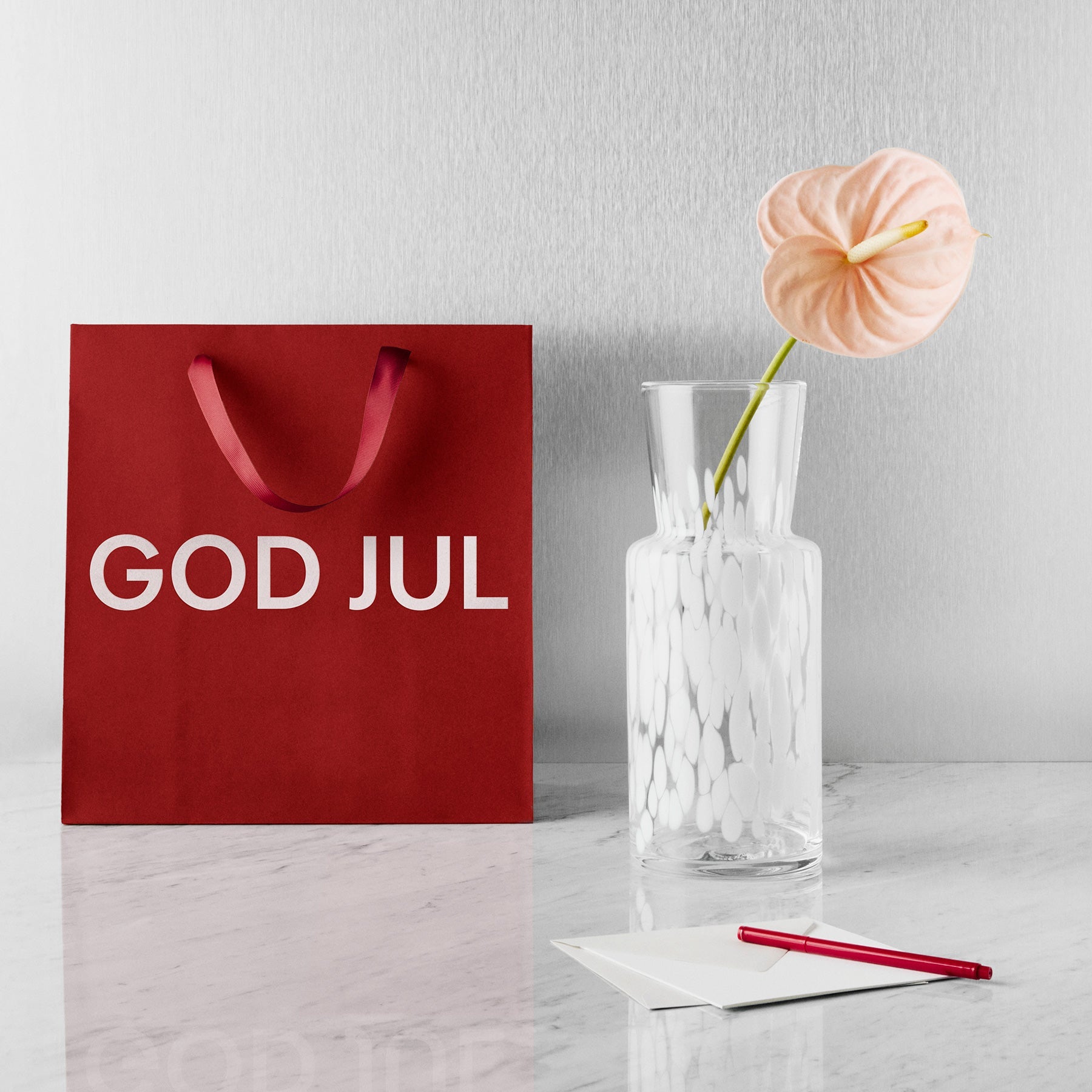 Meadow Winter is like a warm embrace, perfect for creating flower arrangements like a small meadow frozen in time. During the production the vases are rolled in crushed pieces of white glass, which makes each vase unique. The tall vase from Kosta Boda is made to hold tall tulips or sunflowers in a magnificent manner, or shine bright on its own like a star during a cold winter night. Design by Sara Persson.