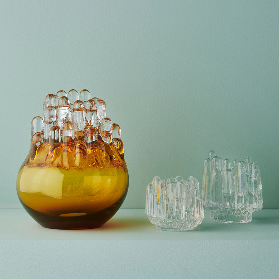 Polar from Kosta Boda, originally launched in 1974 and celebrating its 50th anniversary in 2024, is a series of glass sculptures in different colors and sizes reminiscent of rippling water frozen in time. The amber votive lights up the room, whether grouped or used on its own. Design by Göran Wärff.