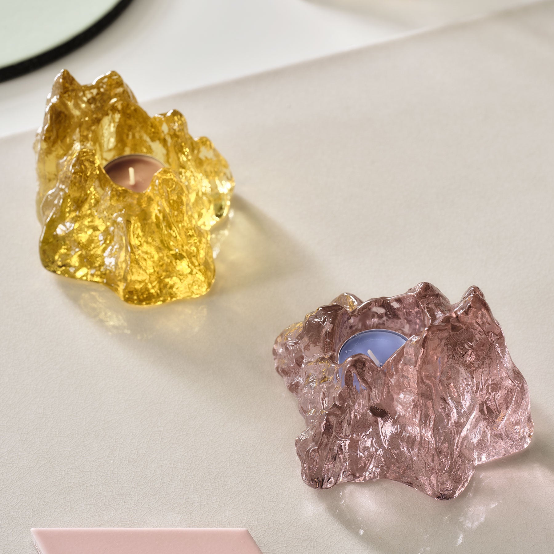 The Rock collection was created as a tribute and paraphrase to the 50th anniversary of Snowball, Ann Wolff's iconic classic. The familiar, irregular surface is reused, but Crystal Cut is a work of art in its own right. This votive is in colored glass, with a dramatic silhouette and a contemporary color palette. Design by Hanna Hansdotter.