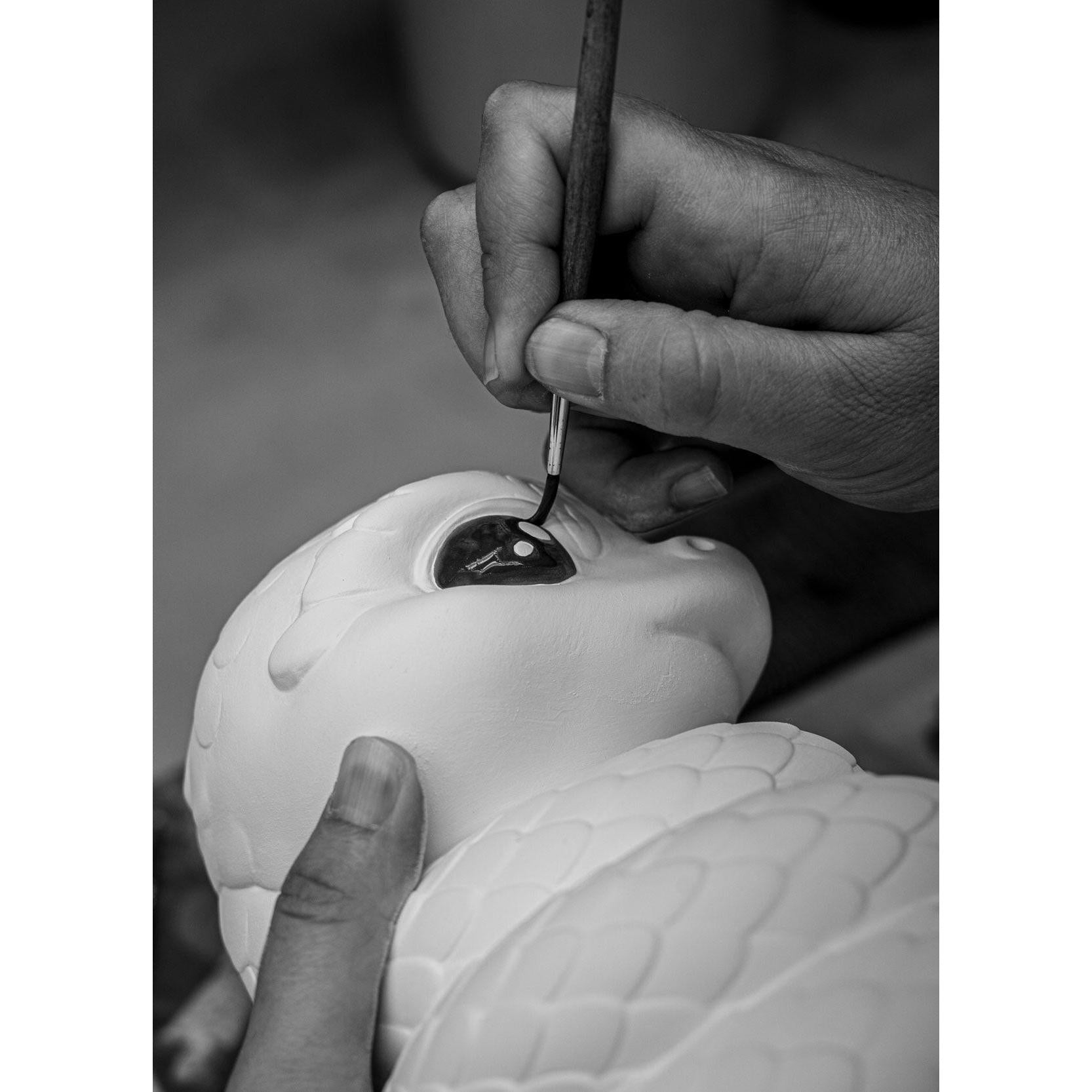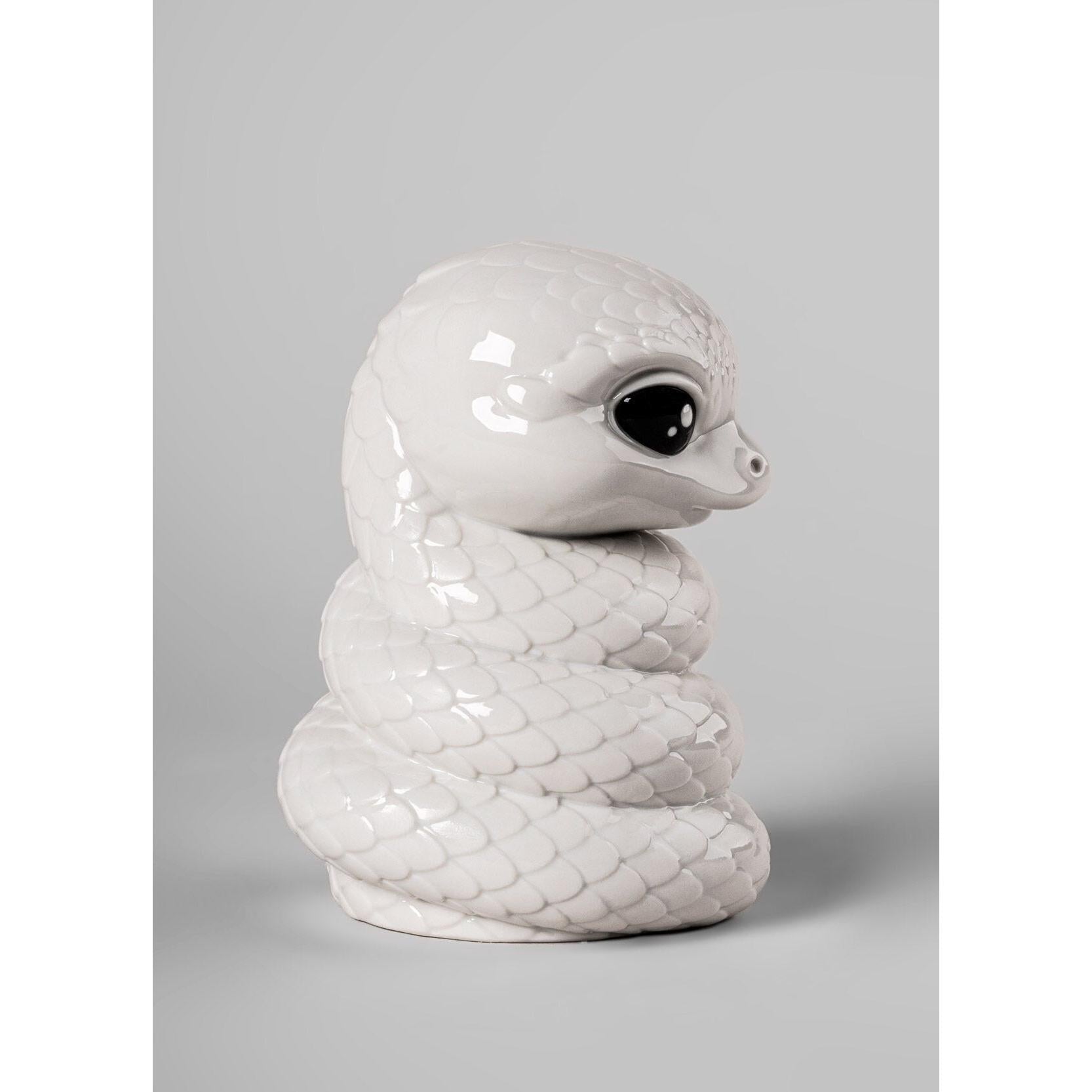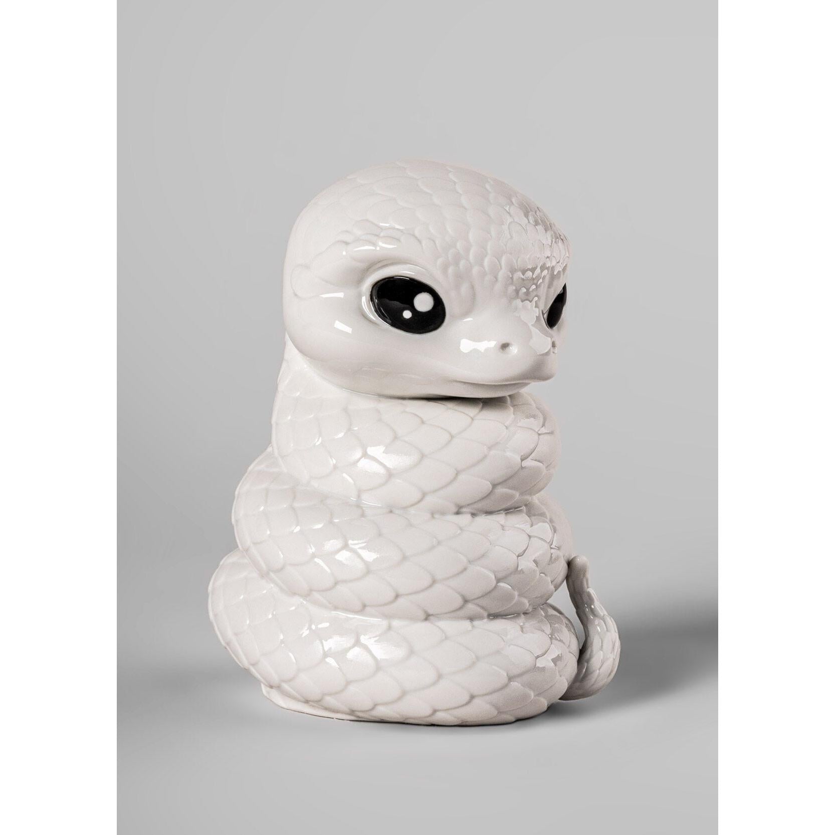 Baby Snake belongs to the Baby Animals collection, a charming fun version of the twelve signs of the Chinese zodiac. The animals which have the power to shape the character and even the fate of people born under their influence are portrayed from a more child-like optic. These depictions bring us closer to the age-old tradition of Chinese culture, with all its mystery and fascination, in a highly personal way. Baby Snake is notable for the expressive face and the intensity of its gaze. The twisted body of the snake and the scales of its skin showcase the sculptural work and highly detailed ornamentation. White was chosen for the decoration, except for the large eyes which are painted a deep black color to accentuate the expressiveness. Another noteworthy detail is that the piece alternates glazed scales with others in a matte finish, which is achieved by softly eliminating the glaze with a small sponge. This application of little touches makes each Baby Snake unique and unrepeatable.