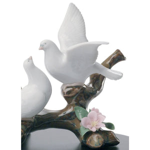 The Florida Station Collection draws inspiration from the ancient Japanese tradition of Hanami (enjoying the beauty of flowers) to create a series of pieces in which flowers have a prominent presence. Two white doves, symbol of love, spread their wings over a cherry blossom, the most appreciated by the Japanese, who come every spring to watch the spectacle of the flowering of these precious fruit trees. The piece is finished in glossy porcelain and decorated with Lladró's classic pastel palette.