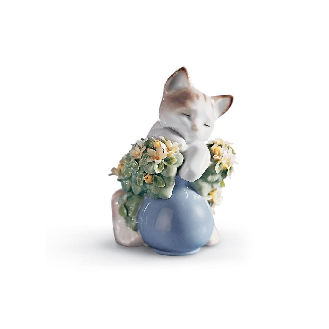 An irresistible combination: a charming sleeping kitten on a beautiful bouquet of delicate flowers, crafted petal by petal by the artists of Lladró. A glossy porcelain piece, decorated in pastel colors, ideal as a gift, collectible or decoration.