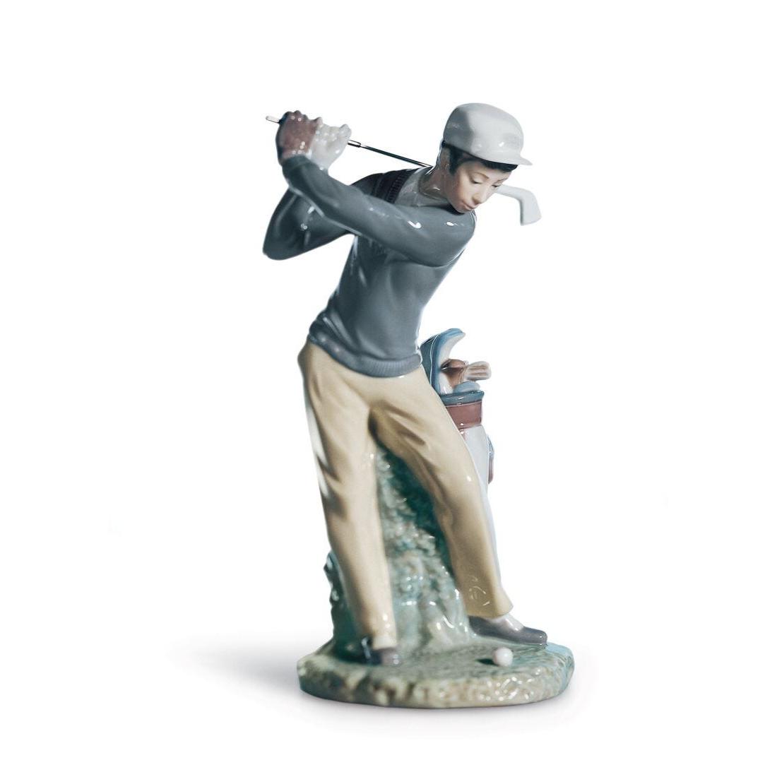 - Glossy porcelain figurine of a golf player with silver plated steel stick in address position next to his club bag.