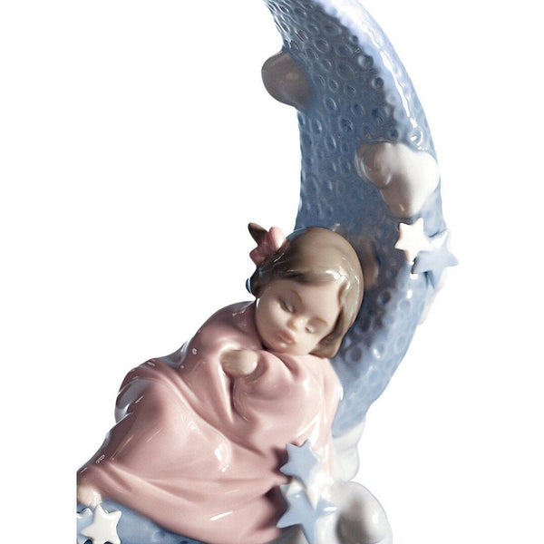 He sleeps soundly. His fantasy takes him far away, flying through space where the moon gently rocks him in his sleep like a beautiful enchanted cradle. A piece of glossy porcelain, decorated in soft pastel colours, perfect as a gift, collectible or decoration.