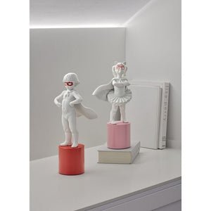 Children’s imagination has no limits. They can transform themselves into superheroes with makeshift costumes. All it takes are some wellington boots, a bathing costume or a tutu and perhaps a towel for a cape and then they are ready to save the world with their super powers. And so they become the cutest little heroes in the house, capable of making magic when they daydream. The finish in white matte porcelain with touches of glaze enhances the wealth of detail in these fun-loving creations. The masks and the stands, in matching tones, provide the note of color.
