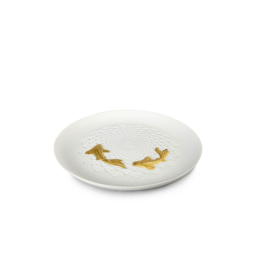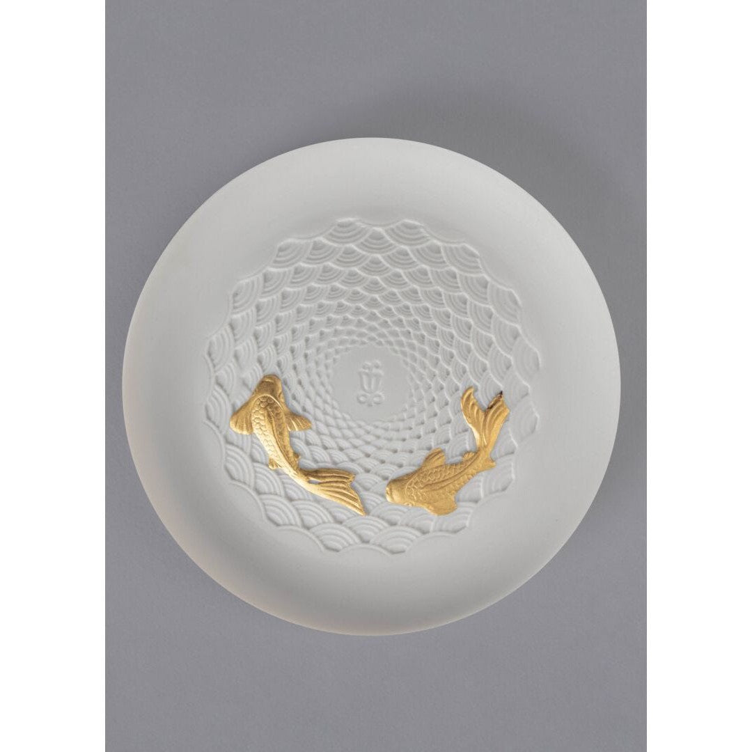 This elegant plate is made in white matte porcelain while the carps decorating it are highlighted in golden luster. A perfect piece as a wedding favor, for special occasions or as a commemorative gift. Handcrafted in the Lladró workshops in Spain.
