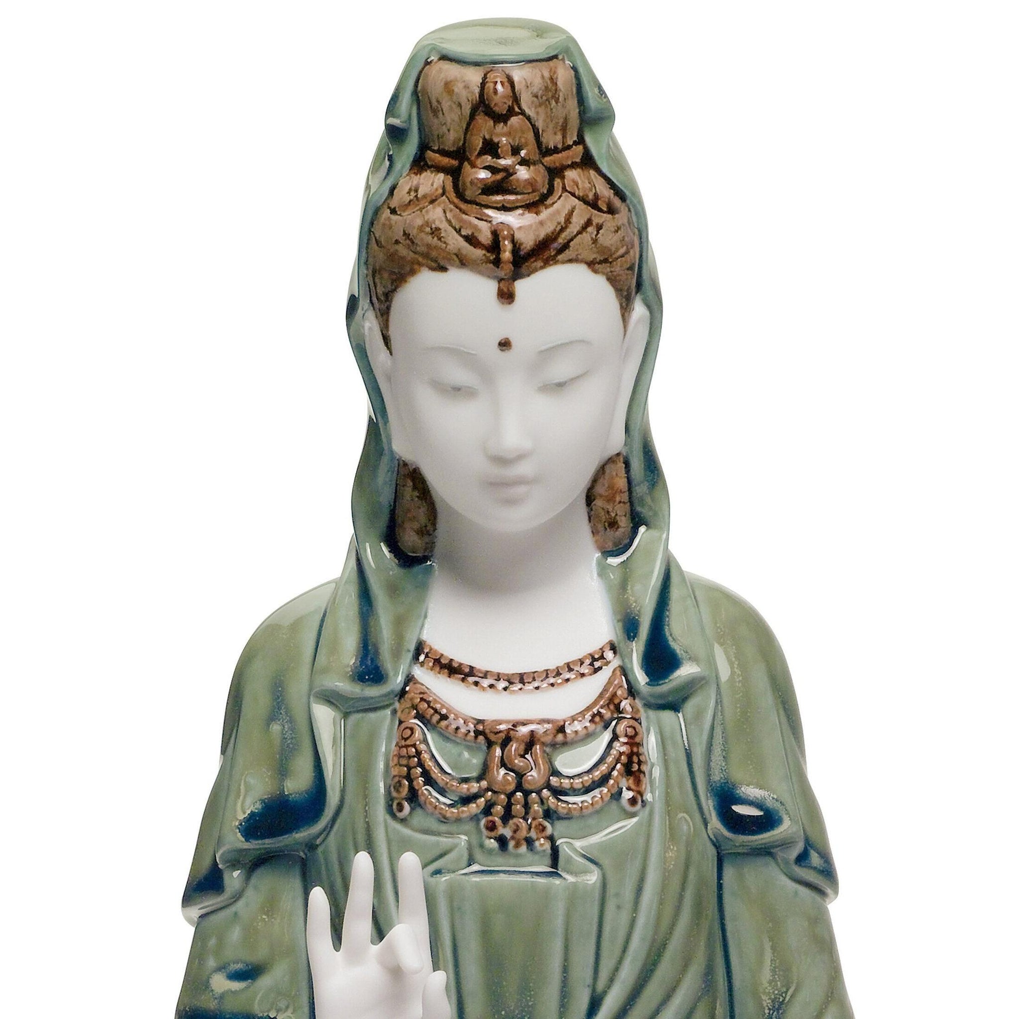 Kwan Yin is the best-loved goddess of Chinese culture. She abounds with love and embodies grace and beauty. Her particular attribute is Mercy, and she is within the reach of anyone. She understands the nature of fear and anguish, comforting those who suffer with compassion. Square wooden base. Made in white porcelain covered in strong green enamels, which give it a unique effect of shadow and chiaroscuro nuances. A glossy white finish version is also available (ref. 01008302)