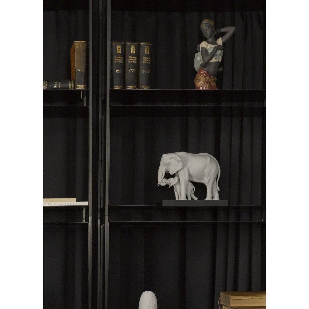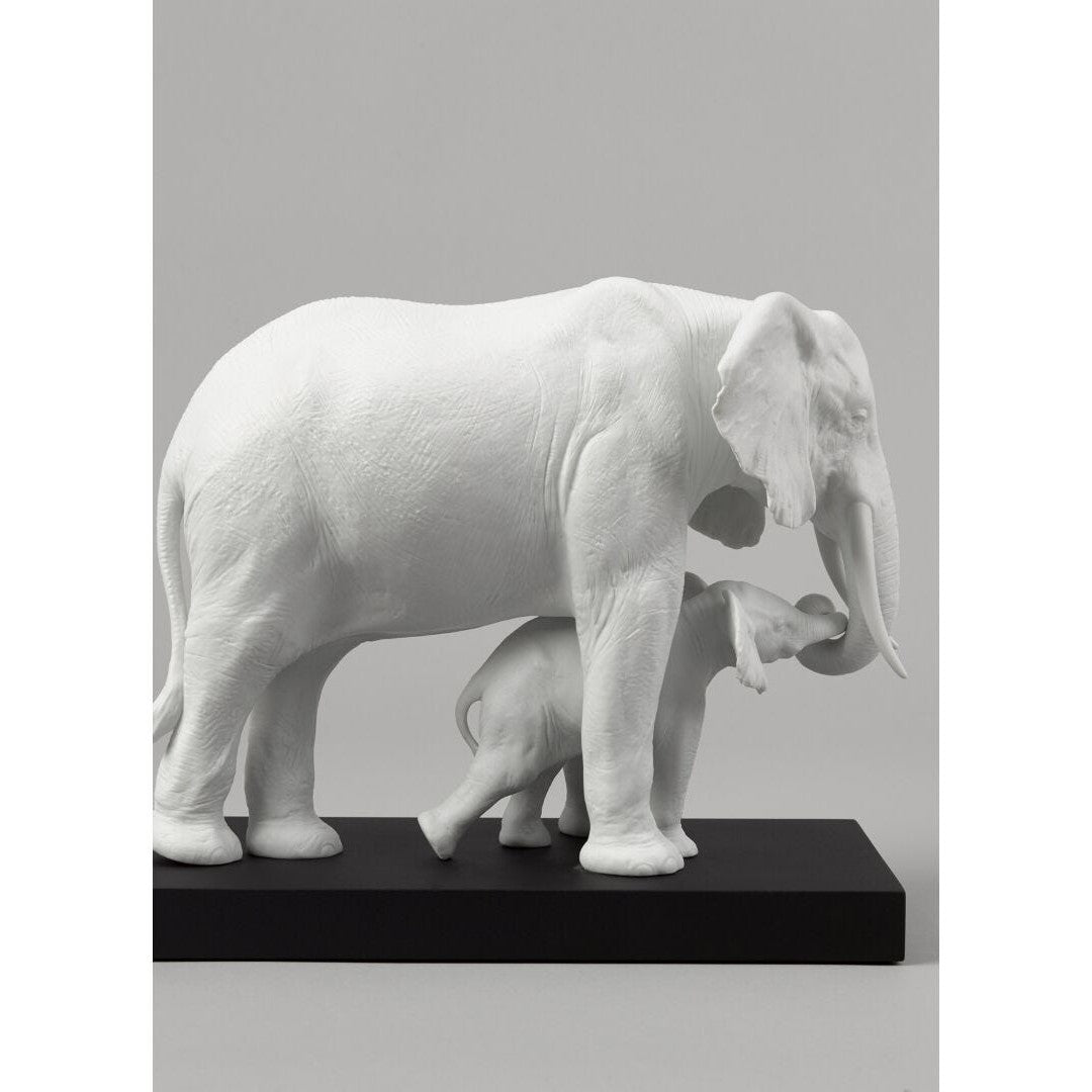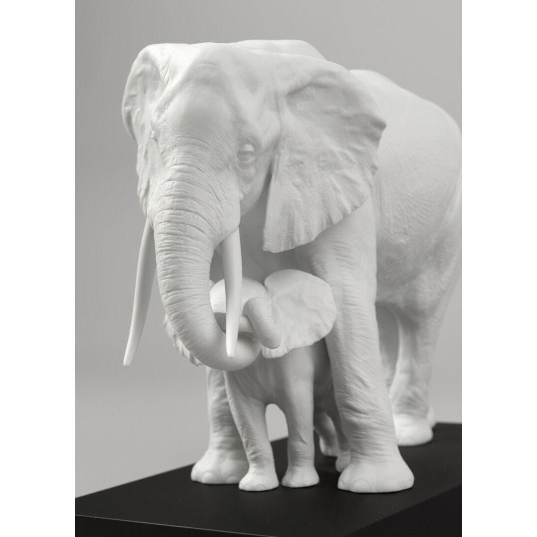 A gesture of maternal love in the most impressive of all the creatures. The mother elephant gently guides her calf in a gesture that's both tender and universal. A matte white porcelain piece of strong decorative impact, perfect for any type of setting.