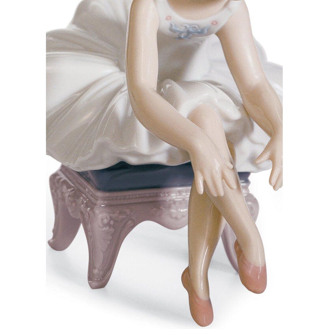 - A glossy porcelain figurine of a small sitting dancer gently putting on her red slipper.