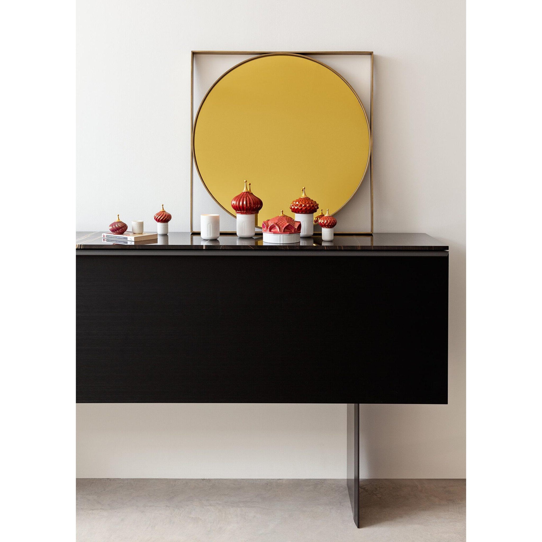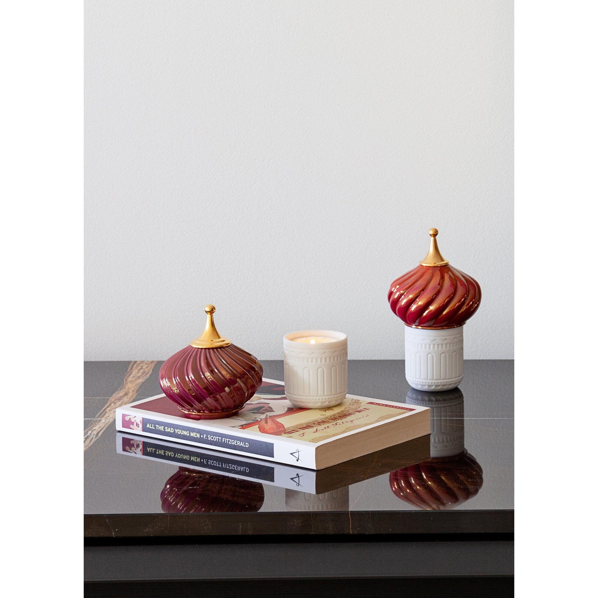 Inspired by the magical world of the tales of the Arabian Nights and their evocation of exoticism, fantasy and adventure. The candles in this collection delicately combine light and aroma to produce a dreamy atmosphere. Held in poetic containers of translucent porcelain, the luminous effect produced by the hand-engraved motifs on the surface transports us to a world of fairytales. The covers are painted in different tones of red with a gold lustre finish. The candle vases are made of translucent porcelain, which filters the passage of light. All candles in the collection carry the same fragrance ´Night Approaches´, based on such special ingredients such as cassis, lotus flower and frankincense, representing the magic of the night and the full moon. Contains 45 grams of natural wax, with a duration of 10 hours. The formulation contains up to 15% perfume and the wick does not produce smoke. As the flame lowers from use in the interior of the vase, this is shown to be an authentic lithophane, revealing the classic lines of its design. Once the wax has been used, the vases of this collection transform into decorative objects which may in turn serve as a box or jewellery holder with an artistic touch of porcelain, handmade in Valencia, Spain.