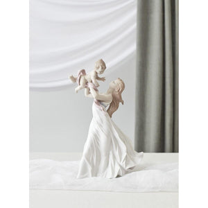 - Glossy porcelain figurine of a mother lifting her baby with a loving gesture in a long white folded dress.