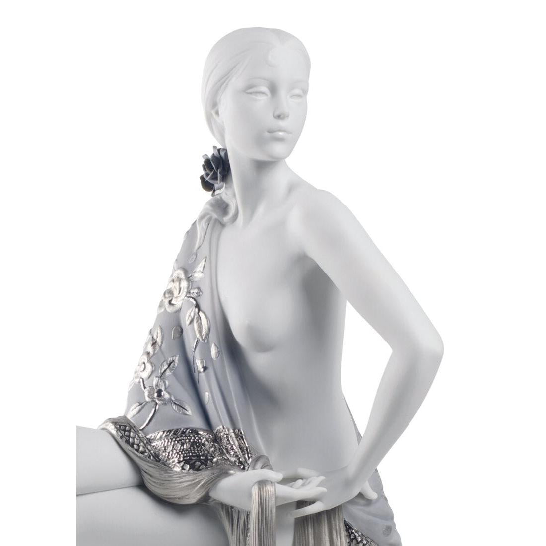 The Re-Deco concept gives a new life to the classic pieces of the Lladró catalogue through a new and striking decorative approach. This piece is given a much more contemporary style through the contrast between the matte white porcelain finish and the silver lustre that highlights the embroidery of the shawl.