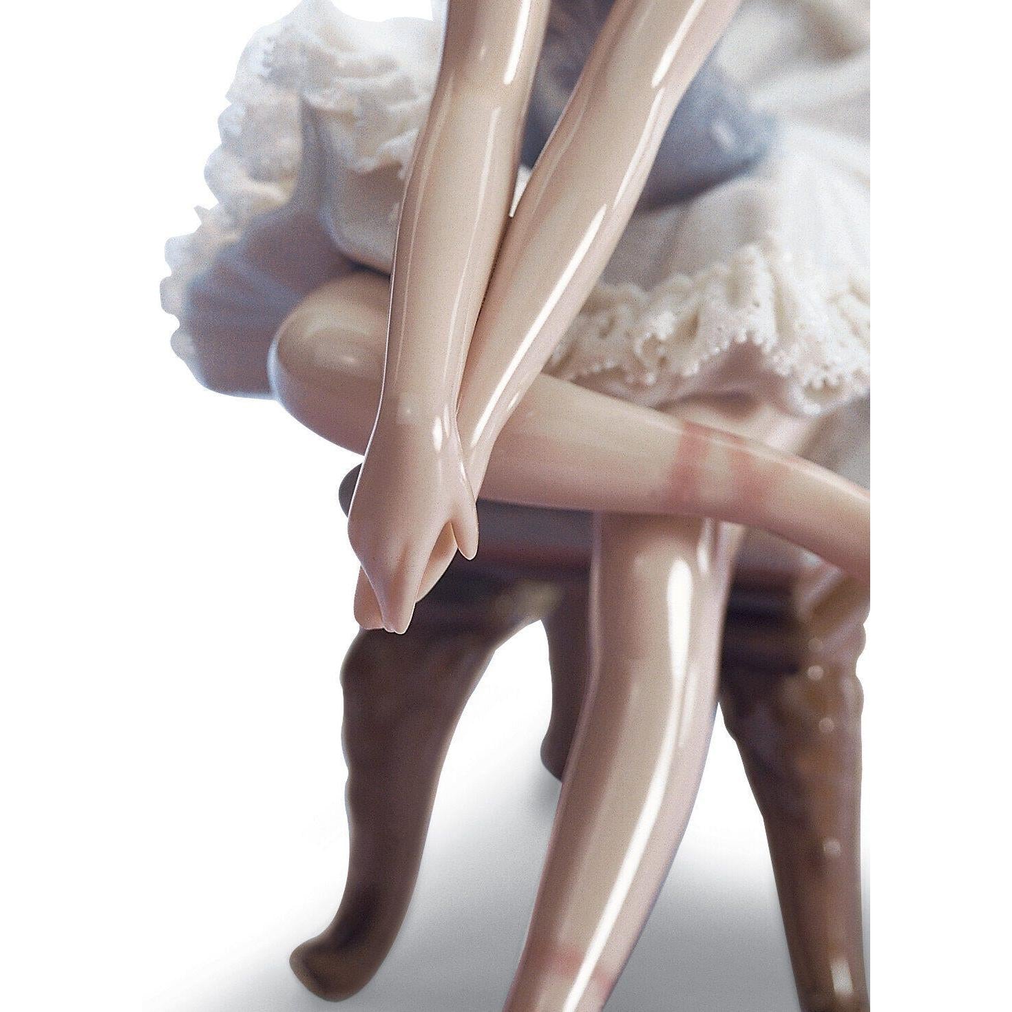 - Porcelain figurine of a dancer sitting on a chair with a tutu dress decorated with tulle and a flower embellishment on its decorations.