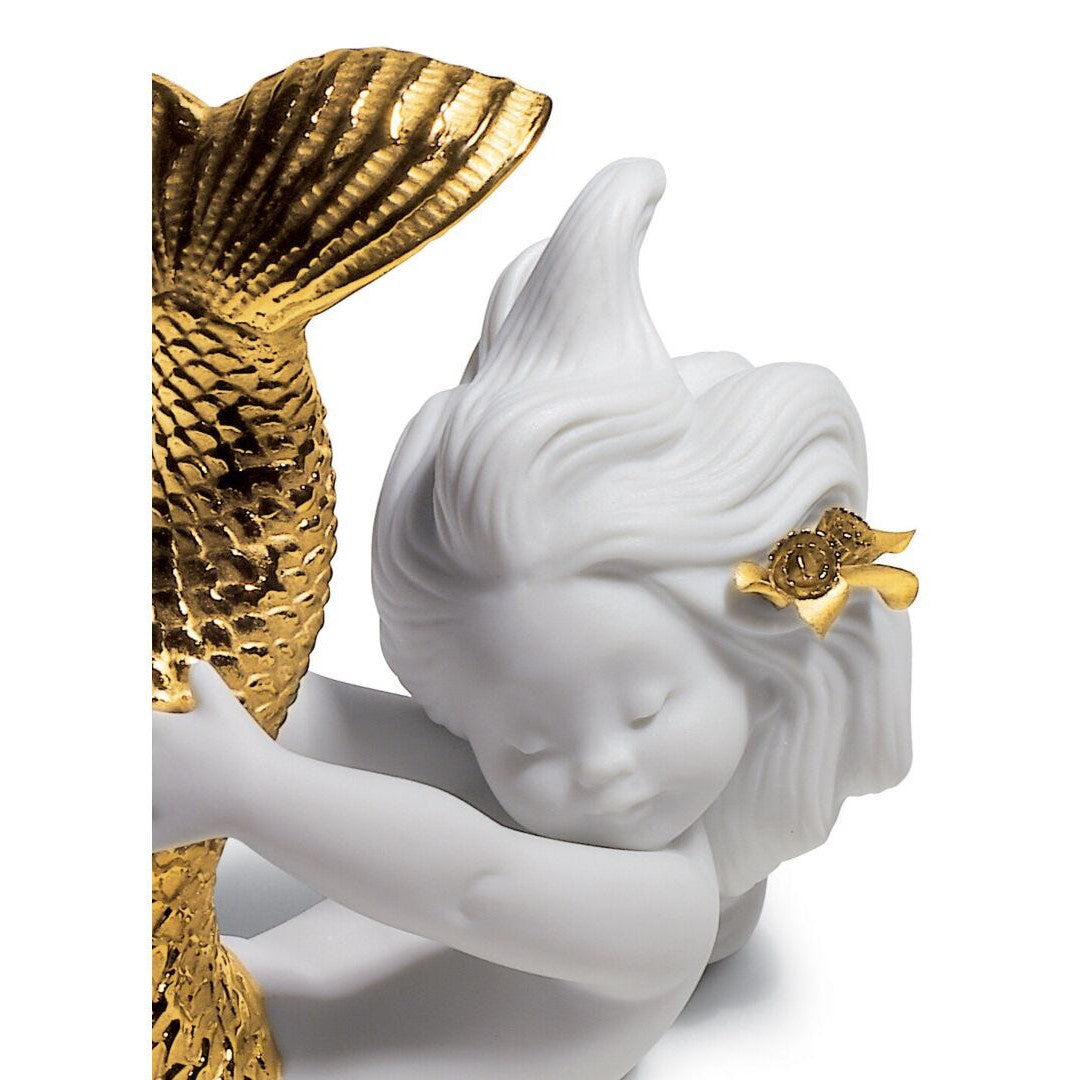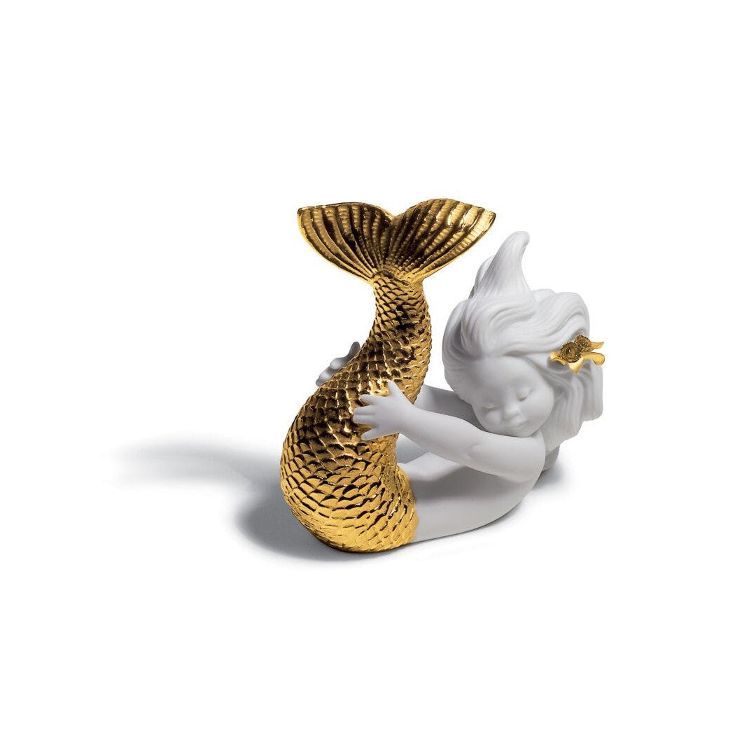 The Re-Deco concept gives a new life to the classic pieces of the Lladró catalogue through a new and striking decorative approach. This charming little mermaid takes on a much more contemporary style thanks to the contrast between the matte white porcelain finish and the golden lustre that highlights her tail and the flowers in her hair.