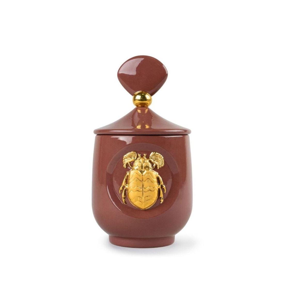 Celebrating the incredible variety of the animal kingdom, the Luxurious Animals collection is the latest addition to the world of home fragrances. Porcelain holders on which different animals have been finely etched by hand and painted with golden luster. This candle, decorated with a scarab, contains 500 grs of natural wax and two wicks. The best scents in unique holders.