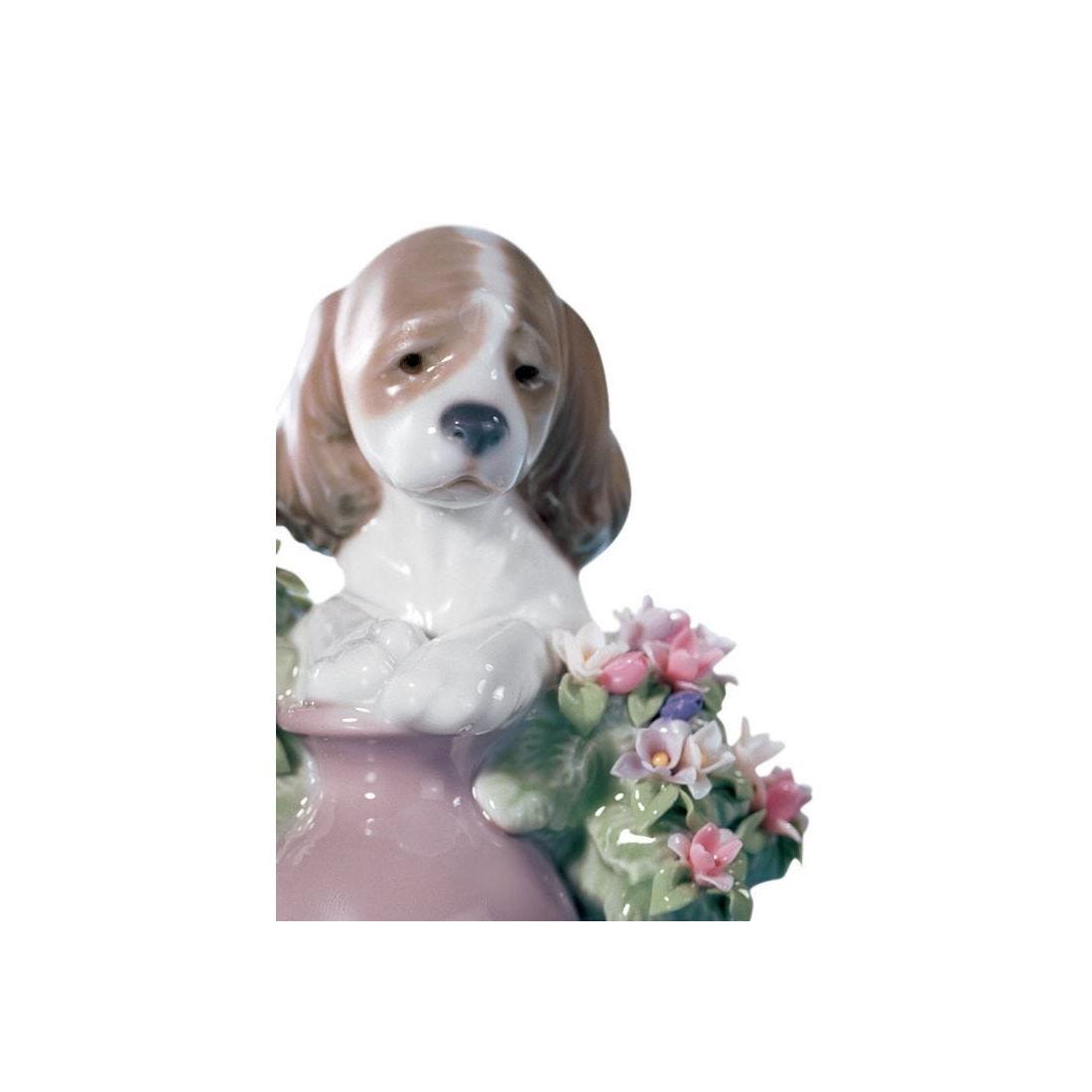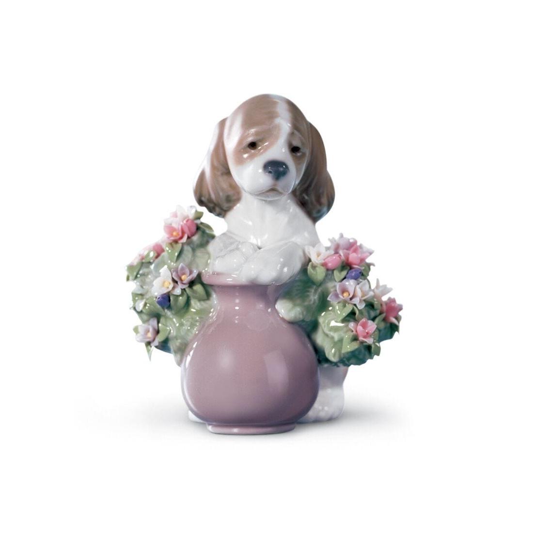 She is in danger of trampling the delicate flowers, but with her sad eyes and affectionate expression it's impossible to get angry with this charming puppy. A piece of glossy porcelain, decorated in pastel colors, ideal as a gift, collectible or decoration.