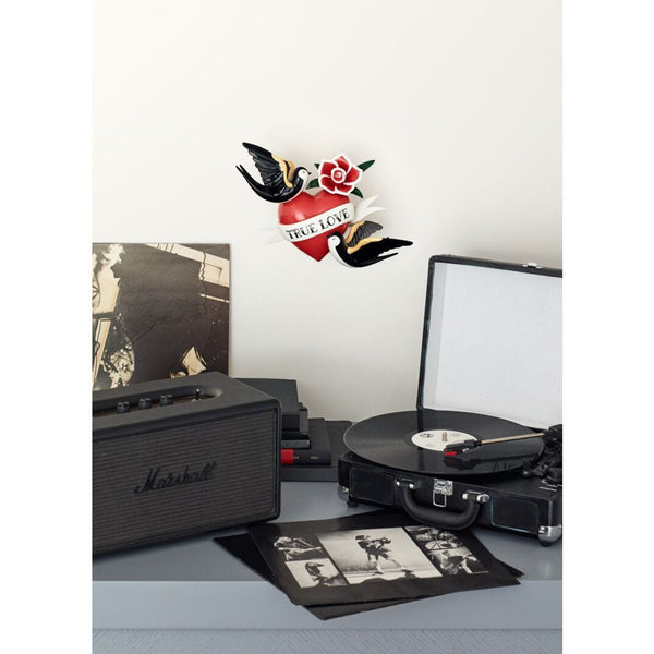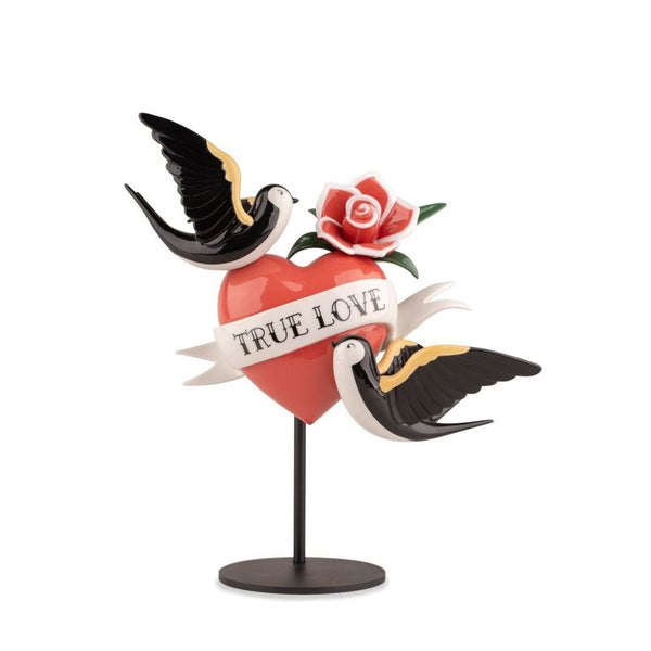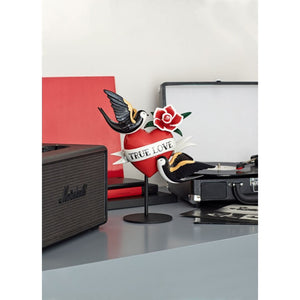 This creation, handmade in glazed porcelain and decorated in black, red and yellow tones, transfers the iconography of tattoos to the world of porcelain and gives it form. And, similarly to the art of tattoo, here each element has its own meaning, in this case a declaration of love. The piece has a metal support so that it can be placed on any surface and it also has a hook on the back to hang it on the wall.