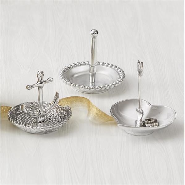 Keep your favorite rings safe but accessible with our beautiful and elegant Beaded Ring Dish. Simply slip the rings off your fingers and onto the cone at the center of the dish. You will never have to worry about losing a ring again. Handcrafted from 100% recycled aluminum.