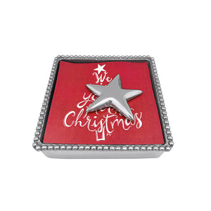 Complete the holiday look with this hand-sculpted Star and festive napkin set. Set includes weight, stack of festive cocktail napkins, and a Beaded Napkin Box. Handcrafted from 100% recycled aluminum.