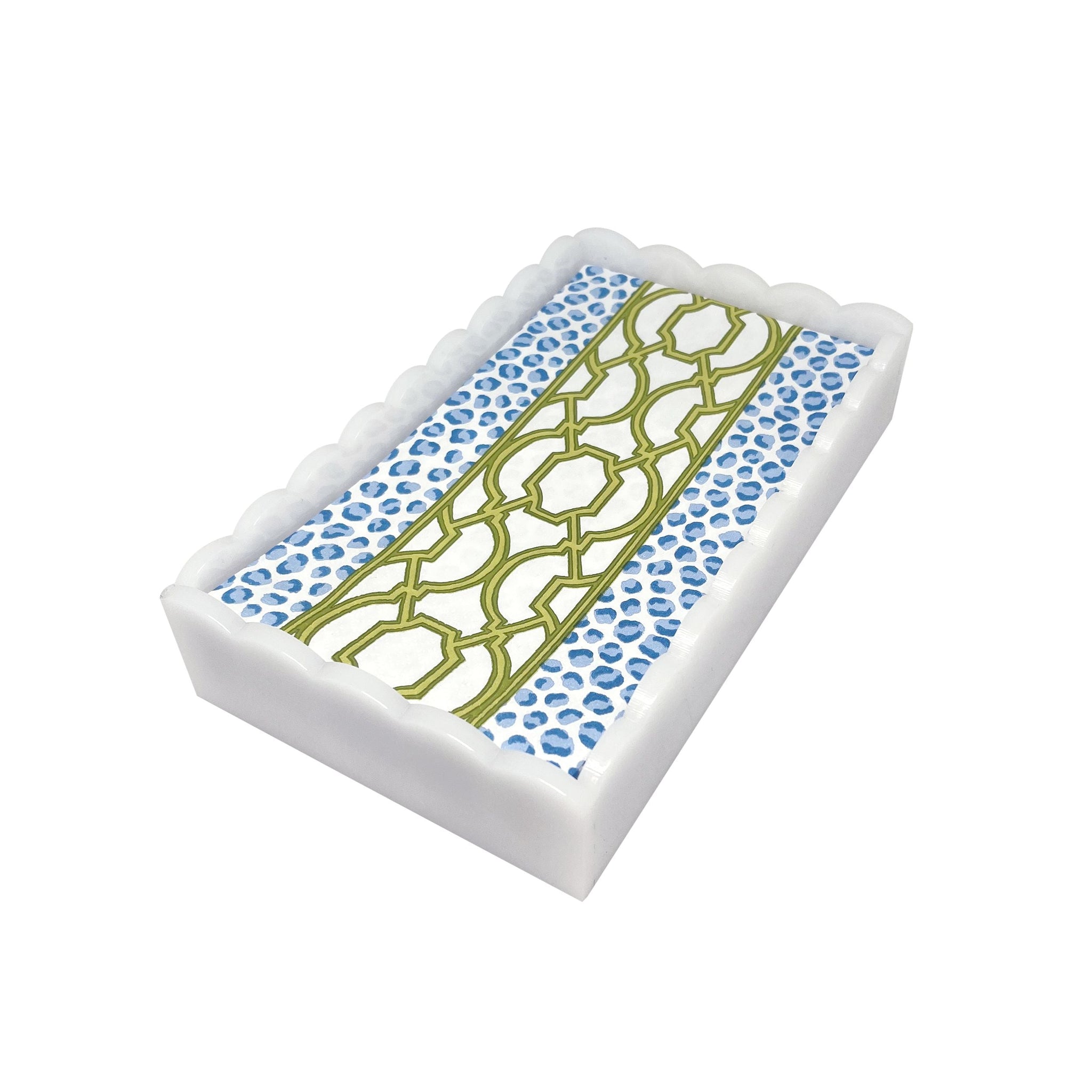 Crisp, clean, and effortlessly chic—our White Scallop Acrylic Guest Towel Box adds a polished touch to any tabletop. Crafted from durable acrylic with charming scalloped edges, it comes stocked with the Knots and Spots Guest Towel by Caspari, making it both stylish and ready to serve. Perfect for everyday elegance or your next gathering. Our White Scallop Acrylic Guest Towel Box is crafted to fit only Caspari guest towels.