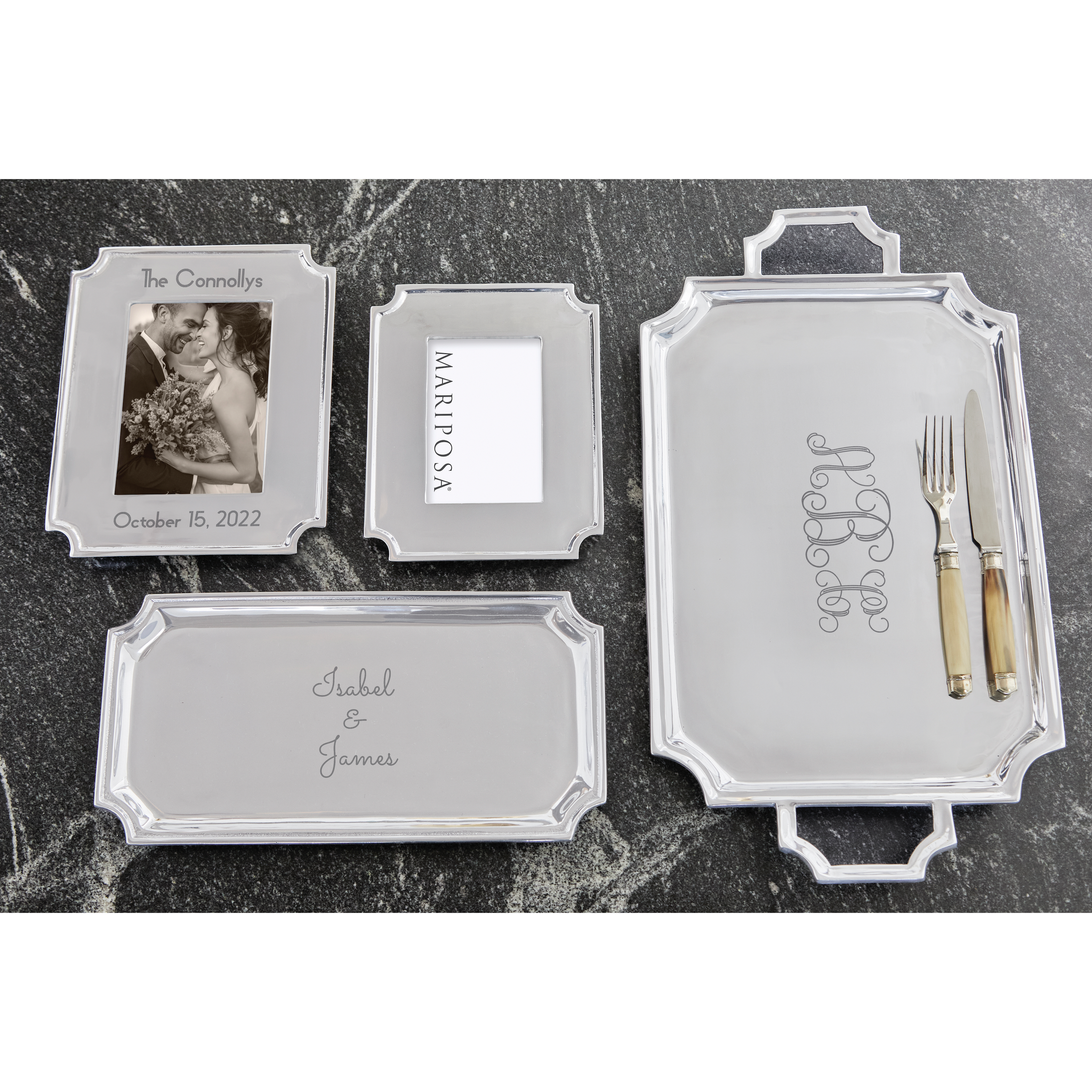 A true Mariposa classic. Introducing the new Linzee Collection - the 4x6 Frame is sophisticated and sleek in nature, and lends itself to any style of home decor. Perfect for a wedding date and family name, you can't go wrong with gifting. It is handcrafted from 100% recycled aluminum and beautifully boxed.