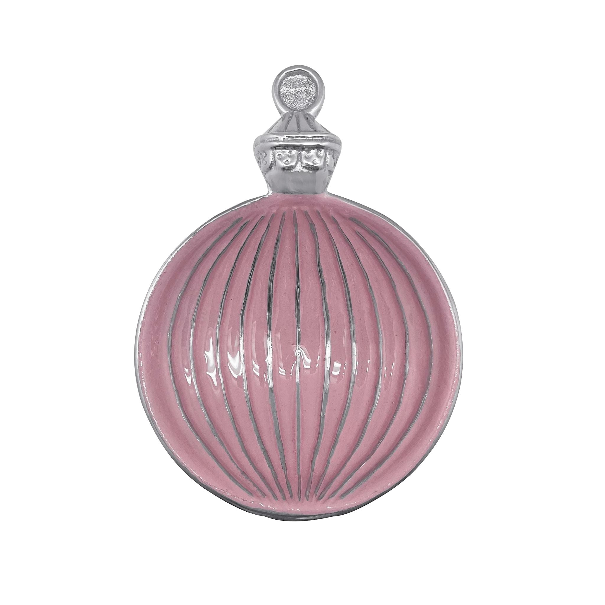 A festive Pink Enamel Ornament Candy Dish adorned with silver trim adds a little winter magic to your next holiday party. Handcrafted from 100% Recycled Aluminum.
