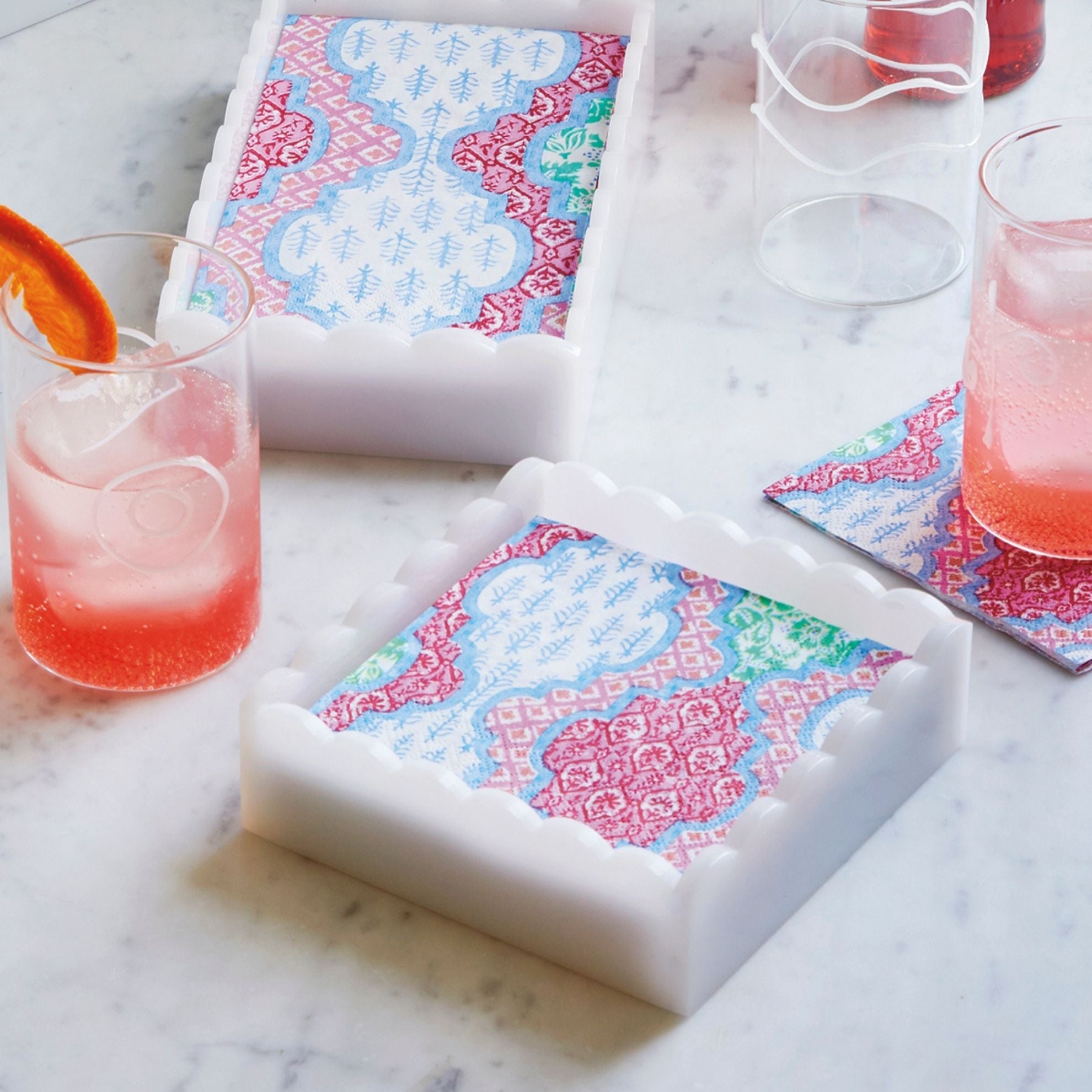 Crisp, clean, and effortlessly chic—our White Scallop Acrylic Napkin Box adds a polished touch to any tabletop. Crafted from durable acrylic with charming scalloped edges, it comes stocked with the Provençal Cotton Pink Cocktail Napkin by Caspari, making it both stylish and ready to serve. Perfect for everyday elegance or your next gathering.