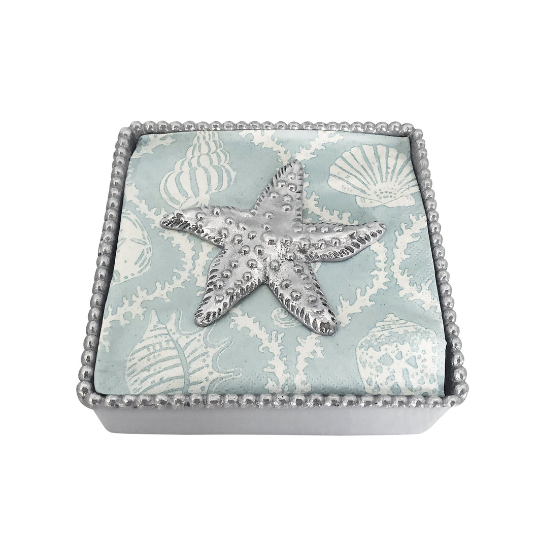 Part of our Seaside Collection, the Sea Star Beaded Napkin Box features a textured beaded border with a sandcast Sea Star Napkin weight atop a beautiful stack of aqua shell napkins.