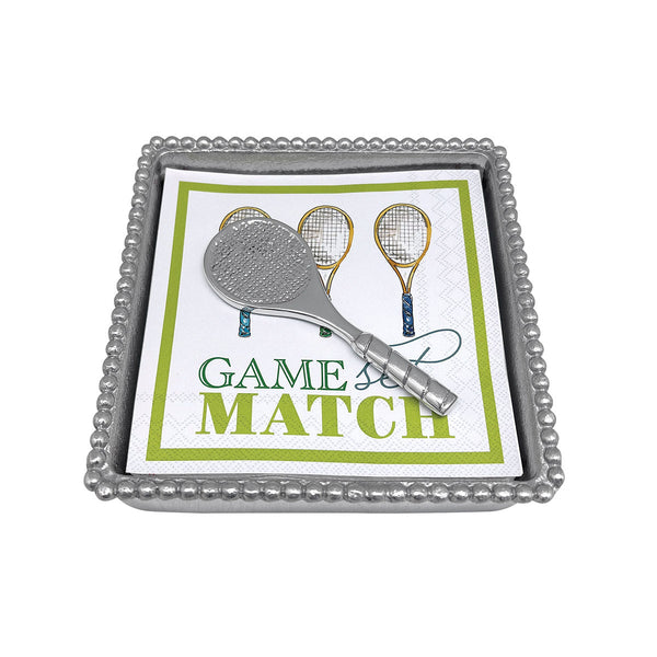 Set includes Tennis Racket weight, stack of "Game, Set, Match" napkins, and a Beaded Napkin Box. Handcrafted from 100% recycled aluminum.