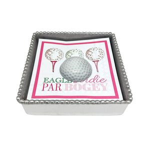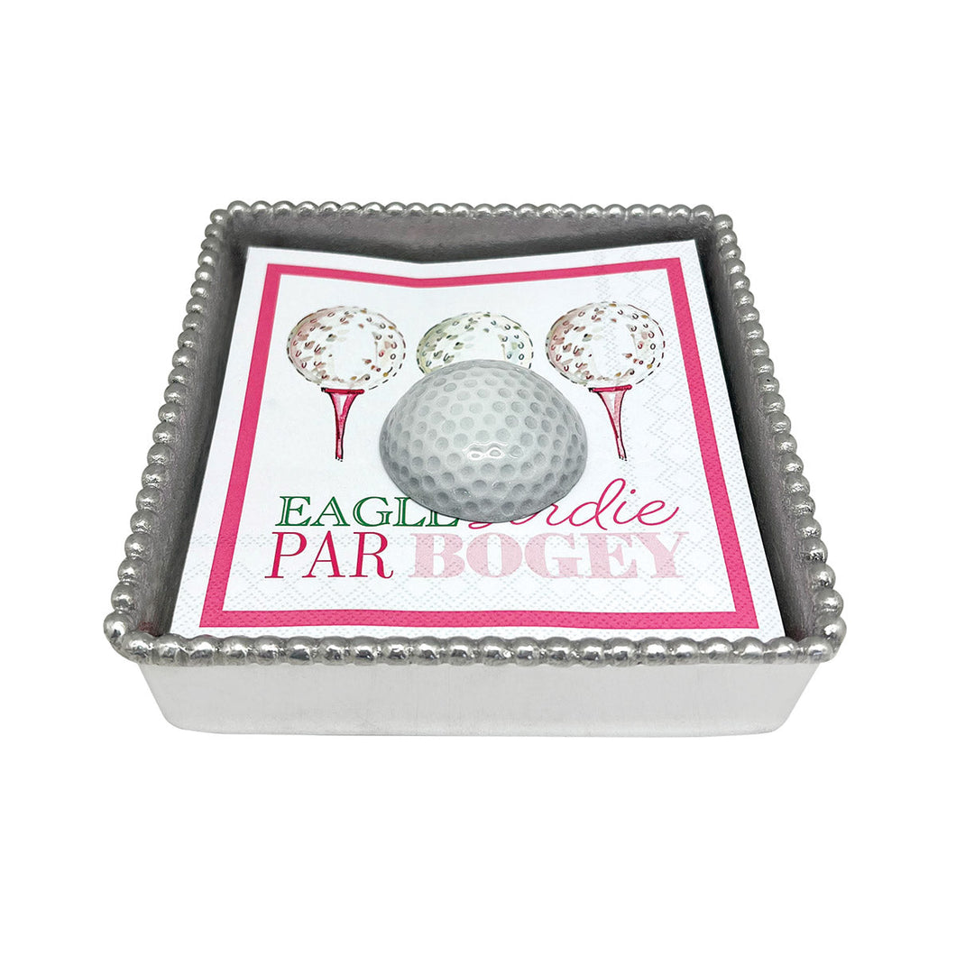 Set includes White Enamel Golf Ball Weight, stack of "Eagle Birdie Par Bogey" napkins, and a Beaded Napkin Box. Handcrafted from 100% recycled aluminum.