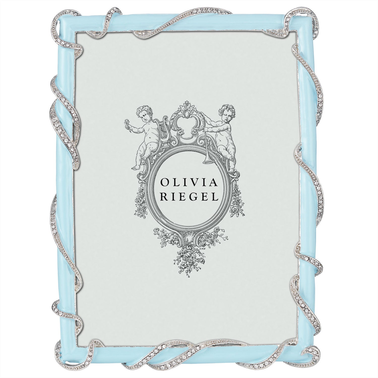 Festive swirl pattern in silver finished pewter. Baby blue hued hand-enameling and hand-set clear European crystals. Elegant gray moiré silk back with easel for vertical or horizontal placement. Tarnish resistant.