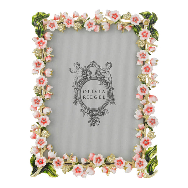 Delightful floral pattern in gold finished pewter, with pink and green hued hand-enameling and hand-set European crystals. Elegant champagne moiré silk back with easel for vertical or horizontal placement. Tarnish resistant.