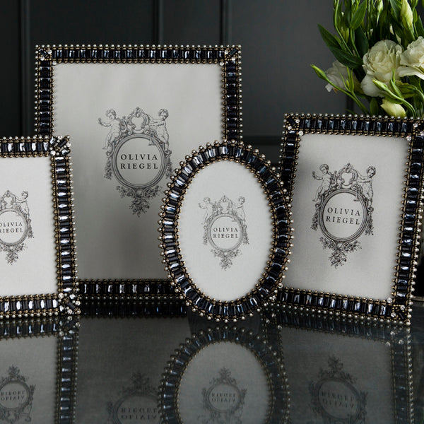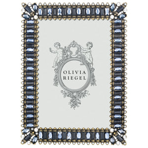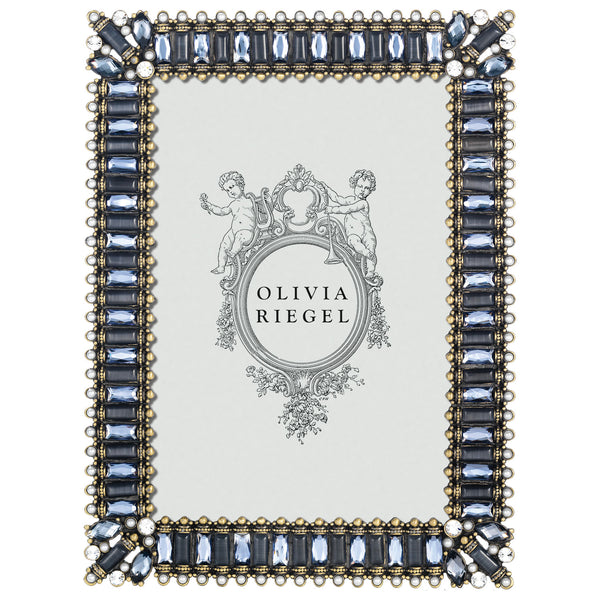 Hand-set clear European crystals, sapphire glass gems, blue cat's eye, and faux pearls in bronze metal finish. Elegant moiré silk back with easel for vertical or horizontal placement.