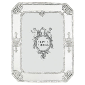 Deco styling with hundreds of hand-set clear European crystals, rhinestones, and mirrored glass in cast pewter with silver tone metal finish and an elegant moiré silk back with easel for vertical or horizontal placement.