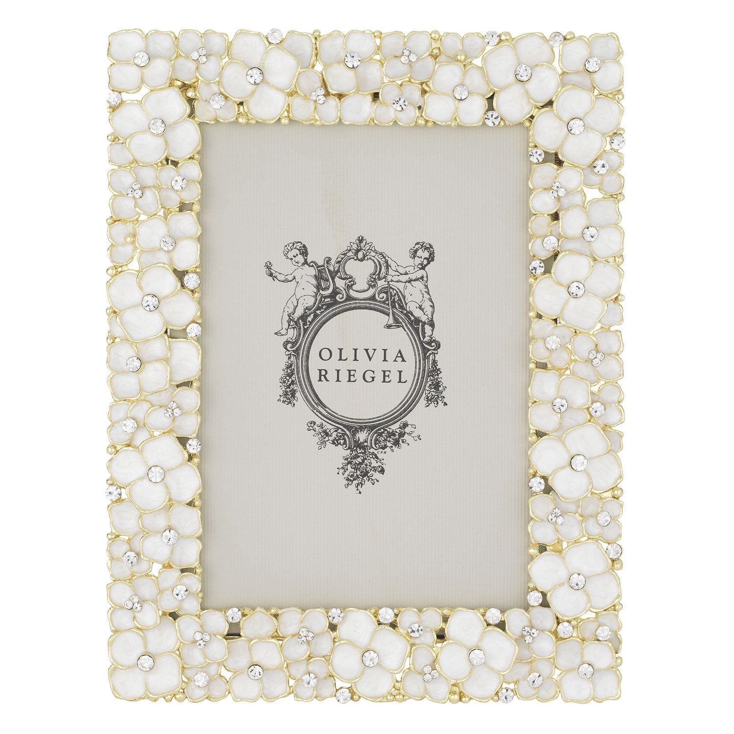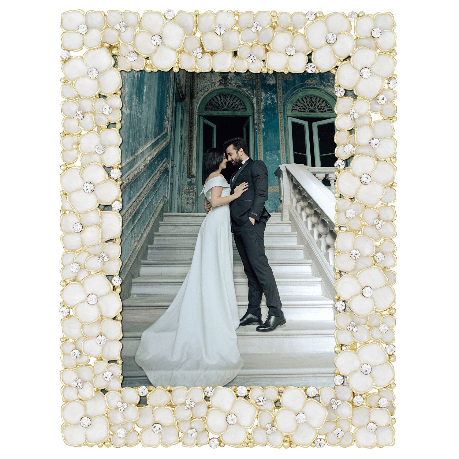 Delicate dogwood blossoms richly cast in gold finished pewter with intricate ivory hued hand-enameling and hand-set clear European crystals. Champagne hued moire silk back with easel designed for vertical or horizontal placement. Tarnish resistant. Signature luxury gift box included.