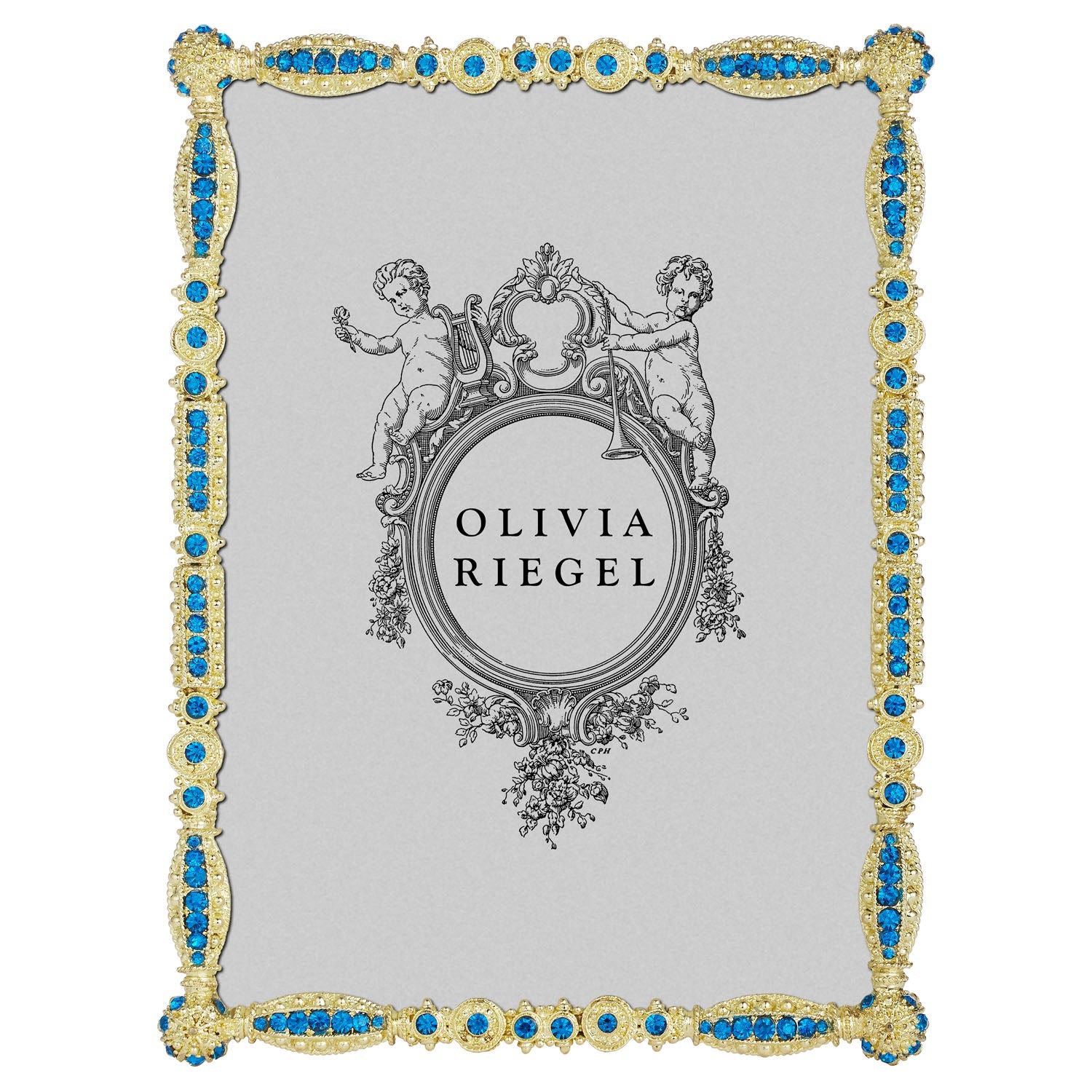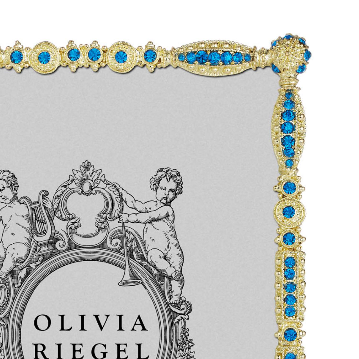 Gold finished pewter with hand-set blue European crystals. Elegant navy hued moiré silk back, with easel designed for vertical or horizontal placement. Tarnish resistant. Signature luxury gift box included.