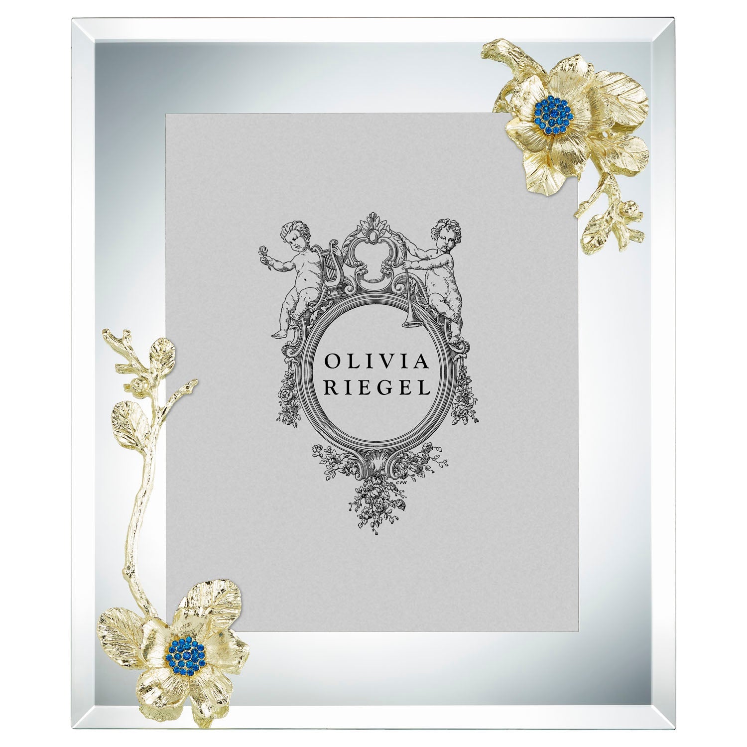 Beveled mirrored glass with gold or silver finished pewter blossom, inspired by the beautiful Rugosa Rose. Hand-set blue European crystals. Elegant navy moiré silk back, with easel designed for vertical or horizontal placement. Tarnish resistant. Signature luxury gift box included.