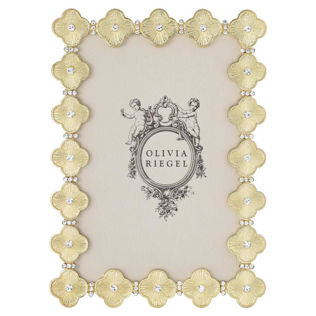 Inspired by the historic quatrefoil design—a decorative element utilized in architecture and the arts for millennia. Gold finished radial-textured pewter, adorned with hand-set clear European crystals. Elegant champagne hued moiré silk back, with easel designed for vertical or horizontal placement. Tarnish resistant. Signature luxury gift box included.