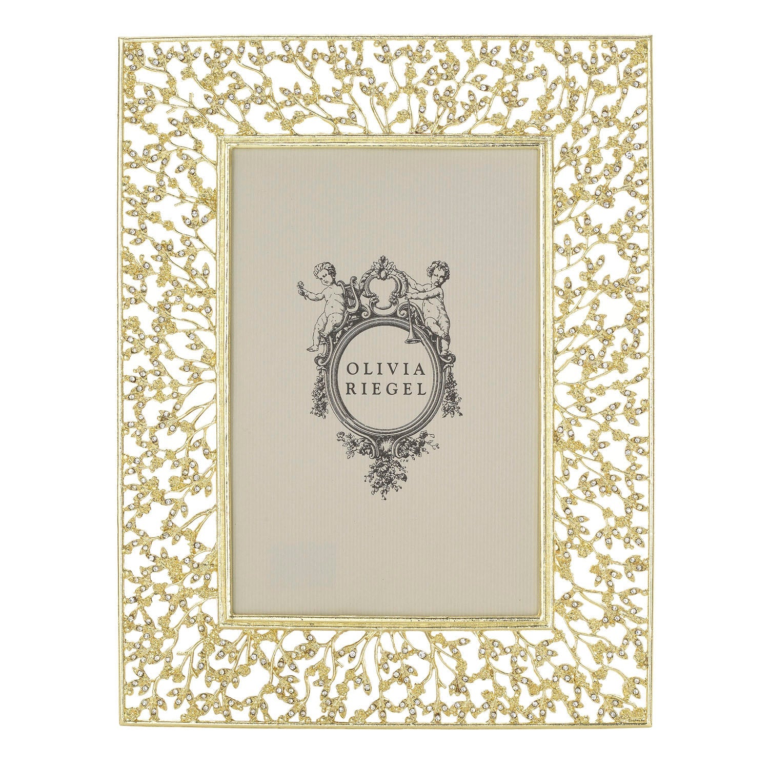Contemporary intricate silver or gold finished pewter branch pattern, adorned with hand-set clear European crystals. Elegant gray moiré silk back. Beveled glass. Tarnish resistant. Signature luxury gift box included.
